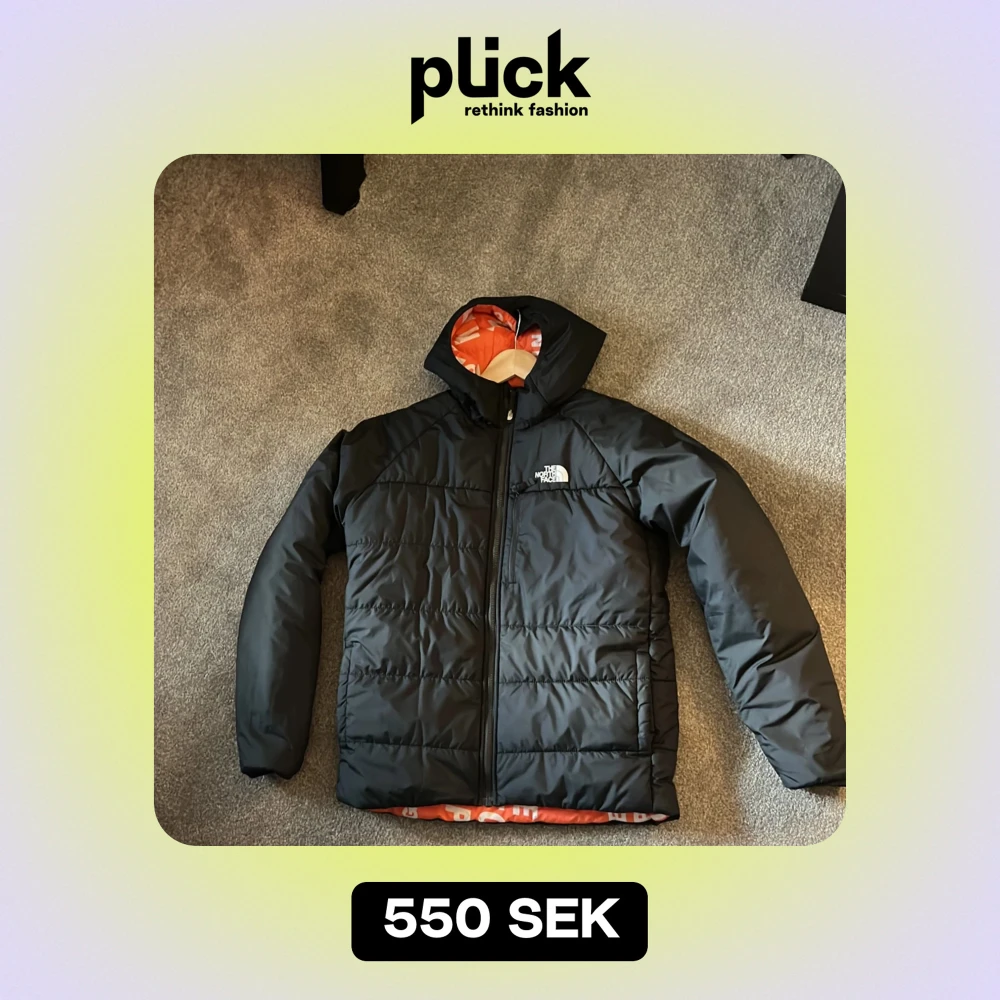 Säljer en snygg och varm svart dunjacka från The North Face. Jackan har en dragkedja framtill och är perfekt för kalla vinterdagar. Den har en huva och är långärmad, vilket gör den extra mysig. Insidan har en cool orange färg med mönster. Perfekt för både vardag och äventyr!