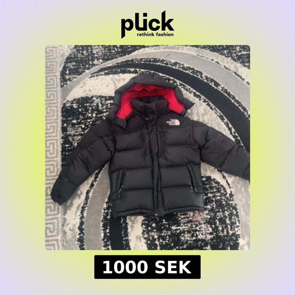 Säljer en svart dunjacka från The North Face med röd insida. Jackan har en huva och dragkedja framtill samt två fickor med dragkedjor. Perfekt för kalla dagar.