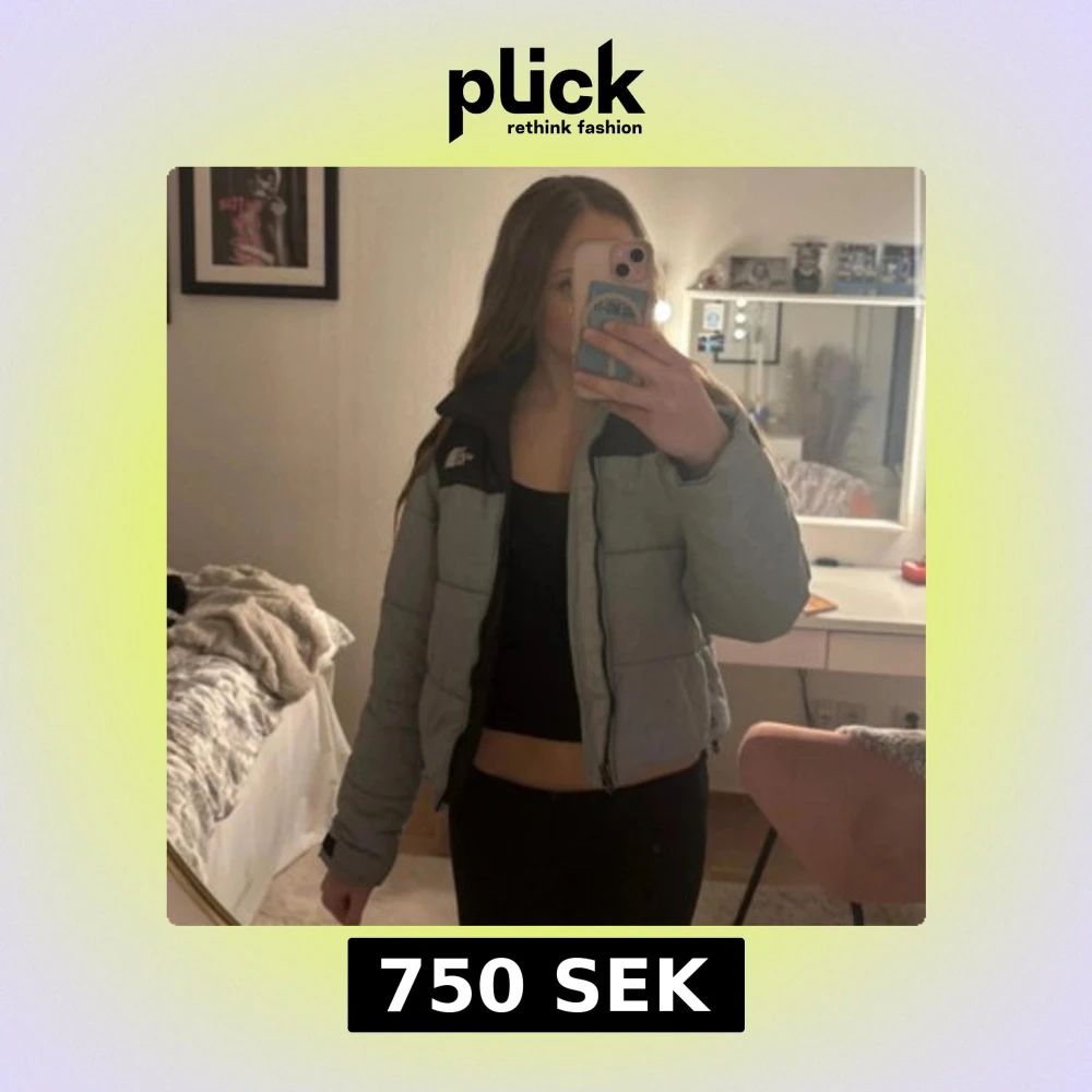 Säljer en grå pufferjacka från The North Face i storlek XS. Jackan har svart axelparti, hög krage och dragkedja framtill. Den är vadderad och har en klassisk boxig passform som är riktigt trendig just nu.