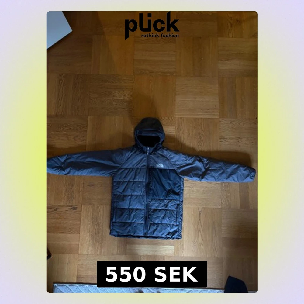 Grå o svart the north face dunjacka som går att vända ut och in så den blir hel svart den är storlek xs
