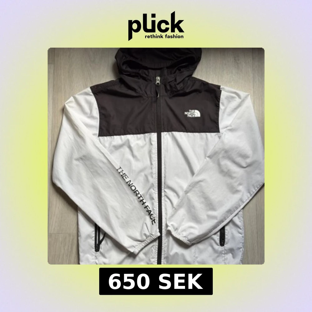 Snygg svartvit vindjacka från The North Face med huva och hel dragkedja. Jackan har två fickor med dragkedja och logga på bröstet samt längs ena ärmen. Lätt och smidig modell i syntetmaterial, perfekt för blåsiga dagar.