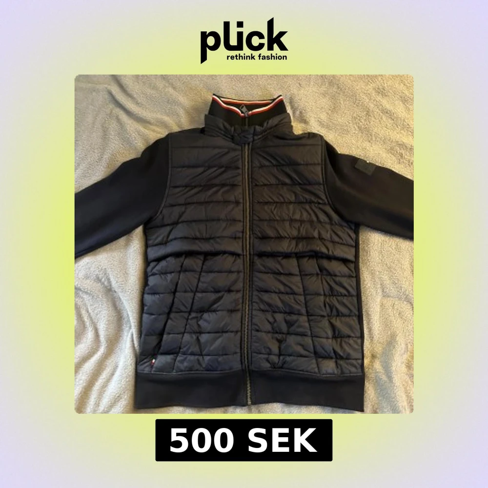 Mörkblå jacka från Tommy Hilfiger med dragkedja framtill och ståkrage med röd, vit och blå detalj. Perfekt för kyliga dagar.