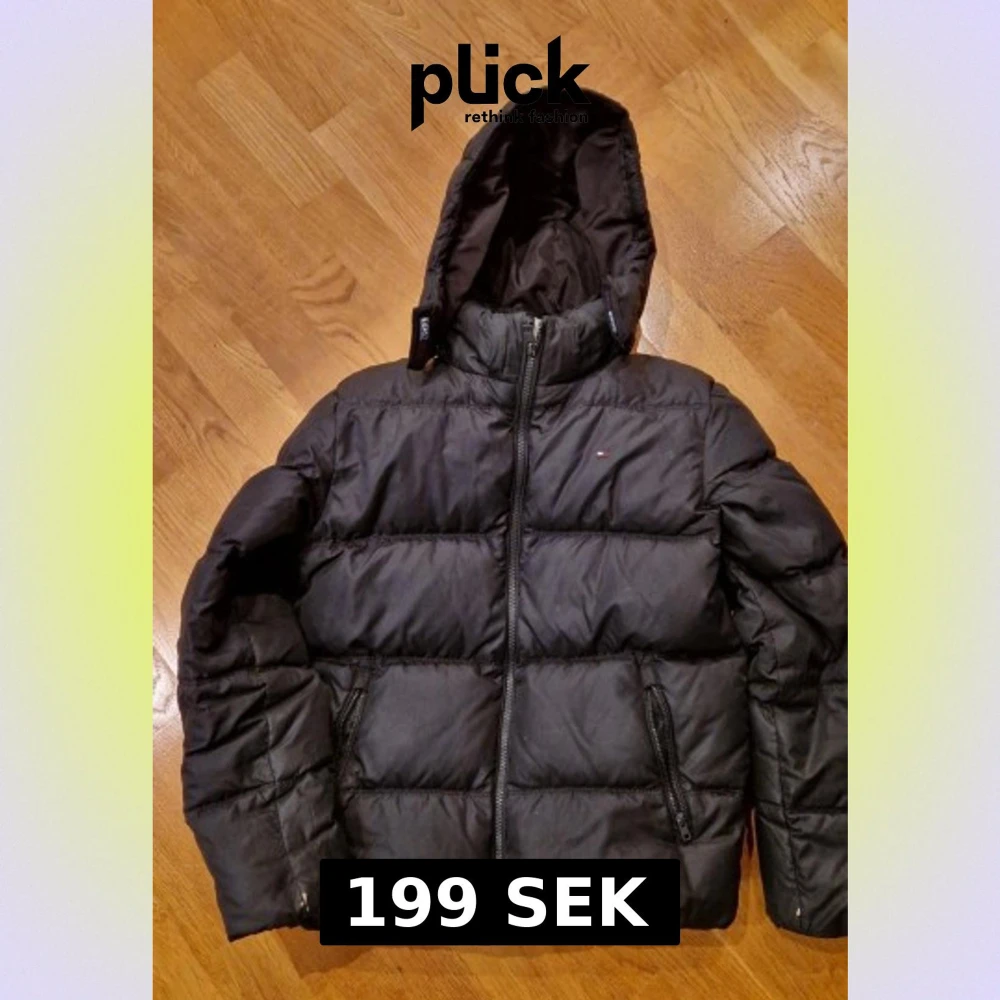 Svart dunjacka med dragkedja och huva. Jackan har flera fickor med dragkedja och en liten Tommy Hilfiger-logga. Finns även Tommy Hilfiger varumärket uppe vid huvan. Små hål vid ärmslutens undersida samt litet hål på framsidans nederkant (samt någon fläck som gör tyget aningens glansigare). Se bilder. Från rök- och djurfritt hem.