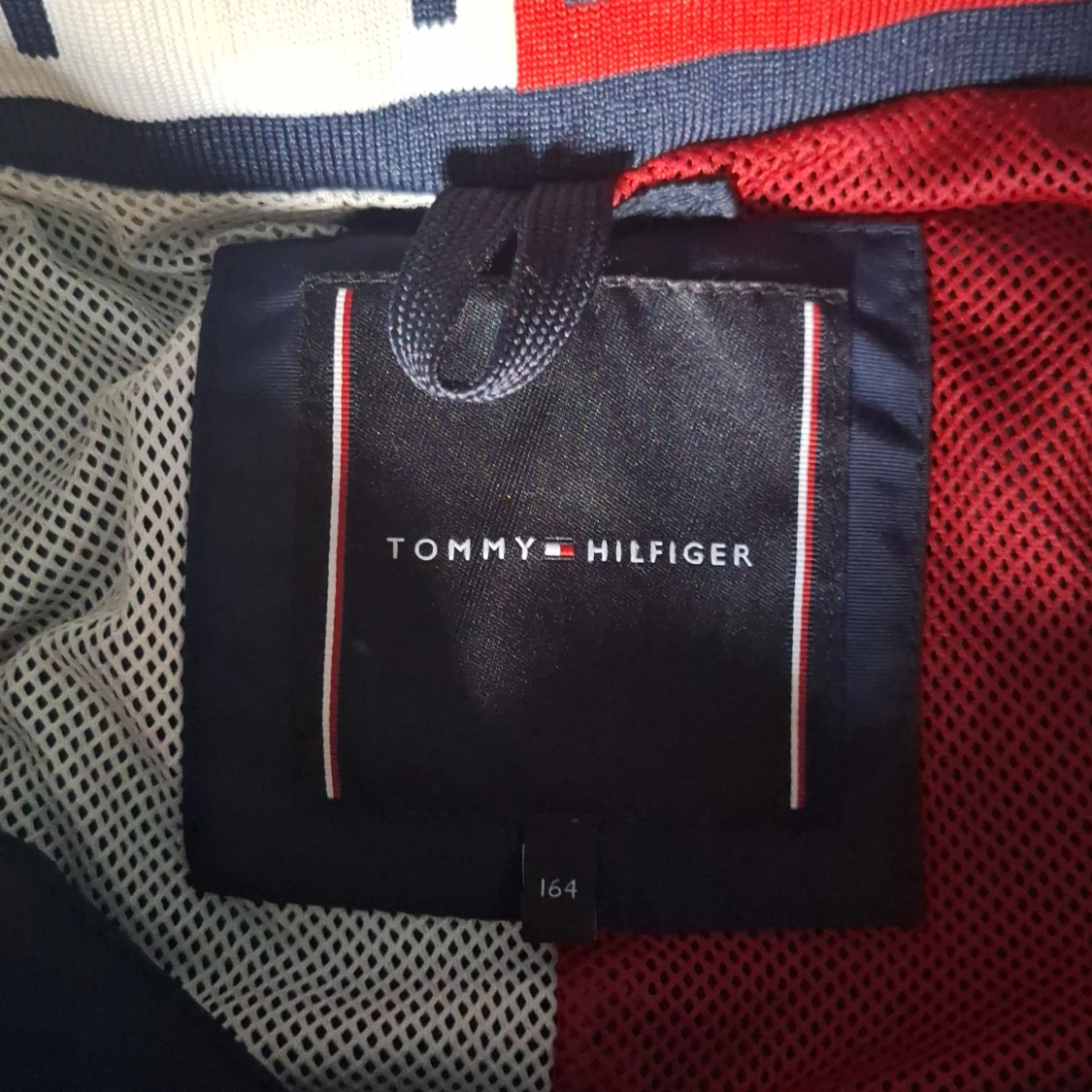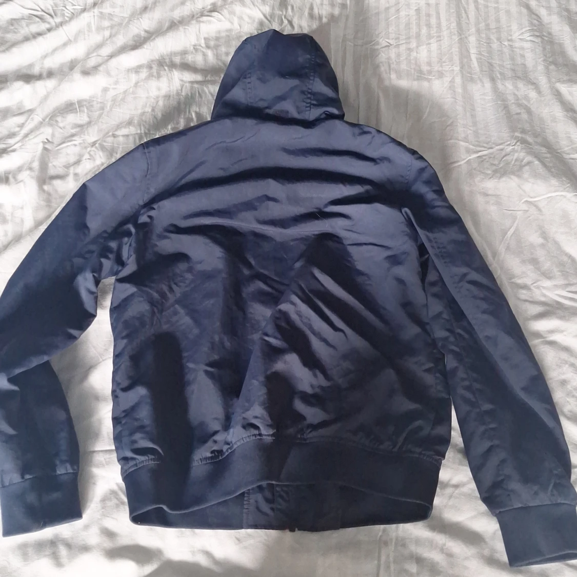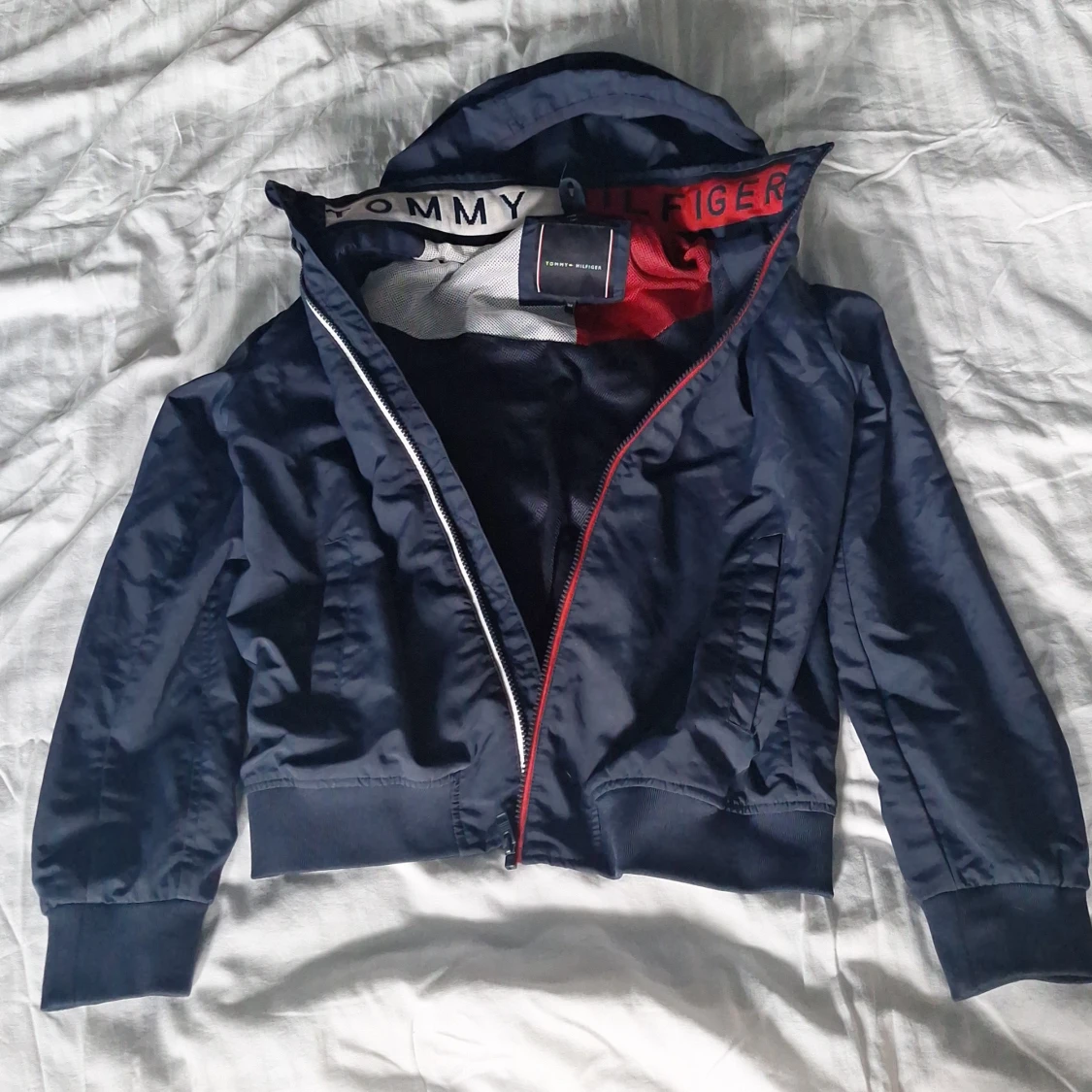 Snygg marinblå vindjacka från Tommy Hilfiger med huva och hel dragkedja med rödvit detalj. Jackan har ribbade muddar, två fickor fram och diskret logga på bröstet. Perfekt för blåsiga dagar och enkel att matcha med det mesta.