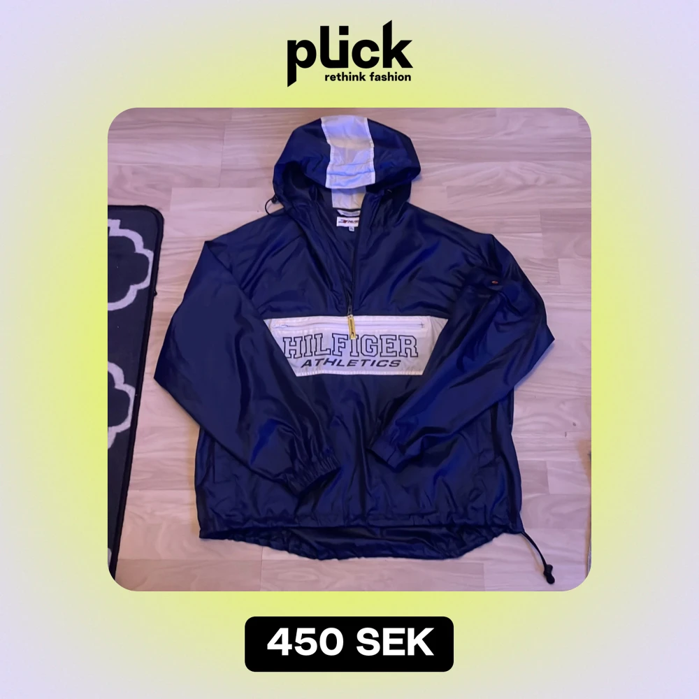 Säljer en vintage blå vindjacka från Hilfiger Athletics i mycket bra skick storlek XL. Jackan har en huva med vit rand, dragkedja framtill och justerbar dragsko i nederkant. Perfekt för vår och höst, med en sportig stil och normal passform.