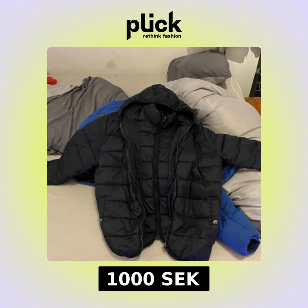 Säljer en svart quiltad pufferjacka med huva. Jackan har dragkedja och knappar framtill samt långa ärmar. Perfekt för kyligare väder.