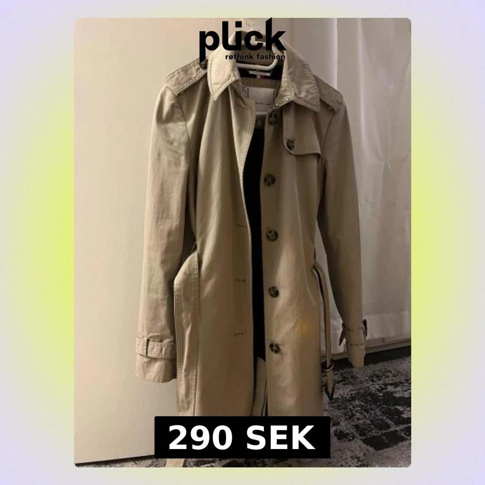 Snygg beige trenchcoat från Tommy Hilfiger med klassisk krage, axelklaffar och bälte i midjan. Jackan har stora knappar framtill och på axlarna, samt justerbara remmar vid ärmsluten. Perfekt för dig som vill ha en stilren och tidlös look.