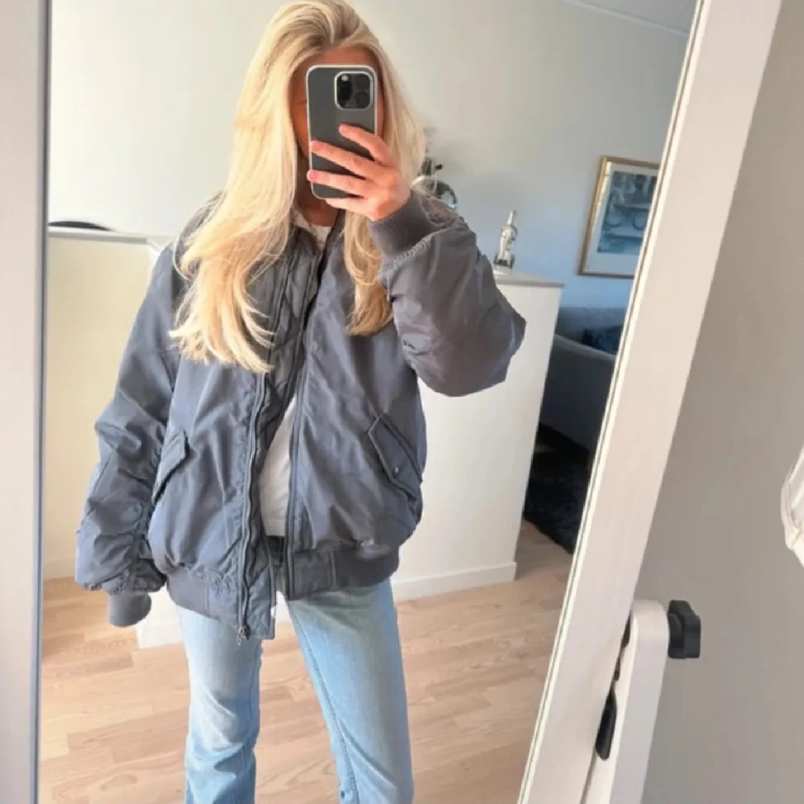 Säljer en grå/blå bomberjacka med dragkedja och ribbade muddar. Jackan har en oversized passform och är perfekt för höst och vår. Den har långa ärmar och en stilren design som funkar till många olika outfits. Använd fåtal gånger så i väldigt bra skick!