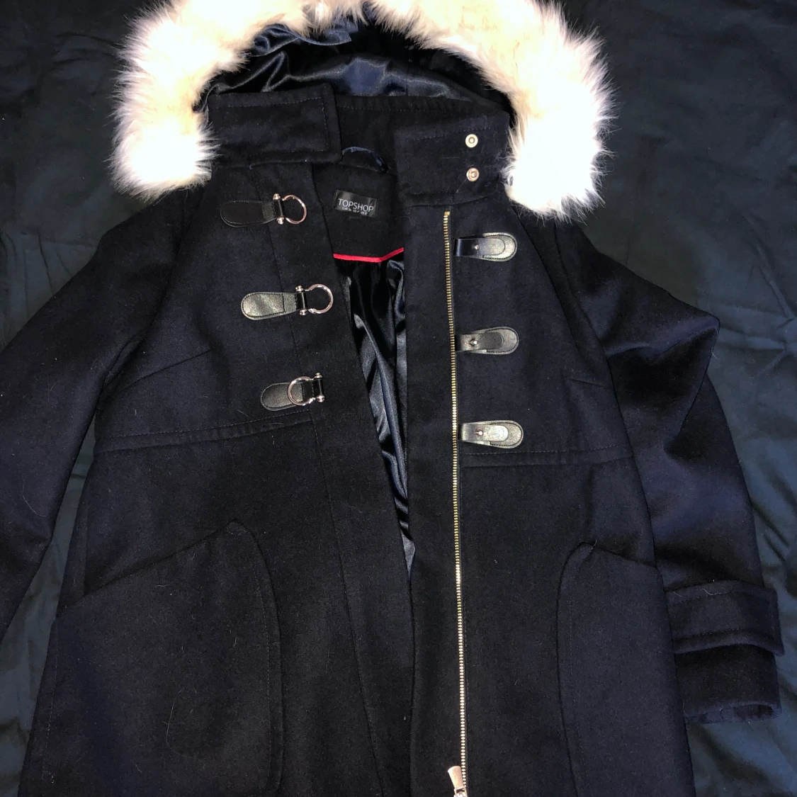 Marinblå kappa med päls från topshop. Storlek 36, säljer för 450 exlusive frakt.