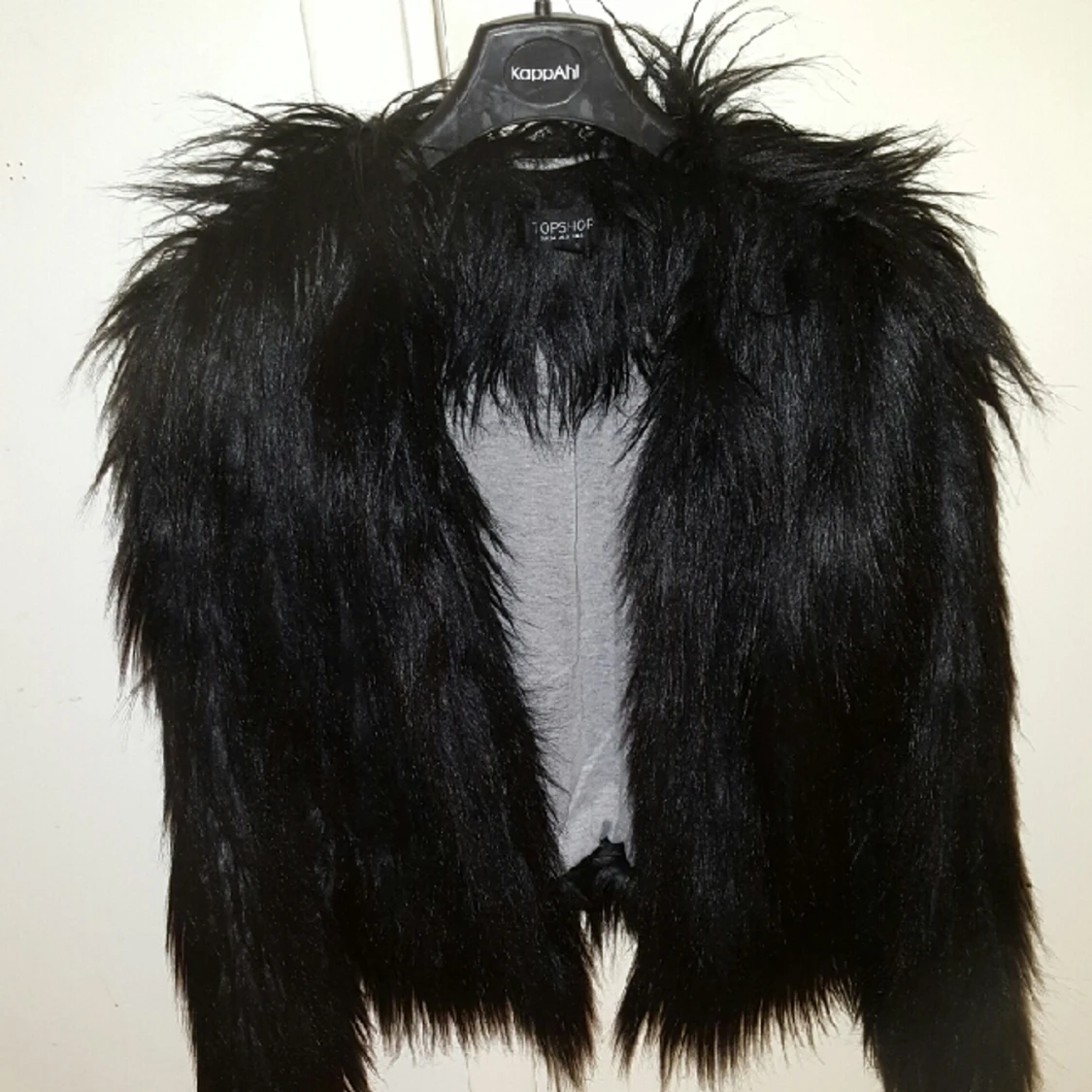 Jacka i fuskpäls från Topshop. sweatshirt foder inne så nästan som någon slags jacka/tröja, alltså inte en vinterjacka. säljes pga för liten. bra skick!