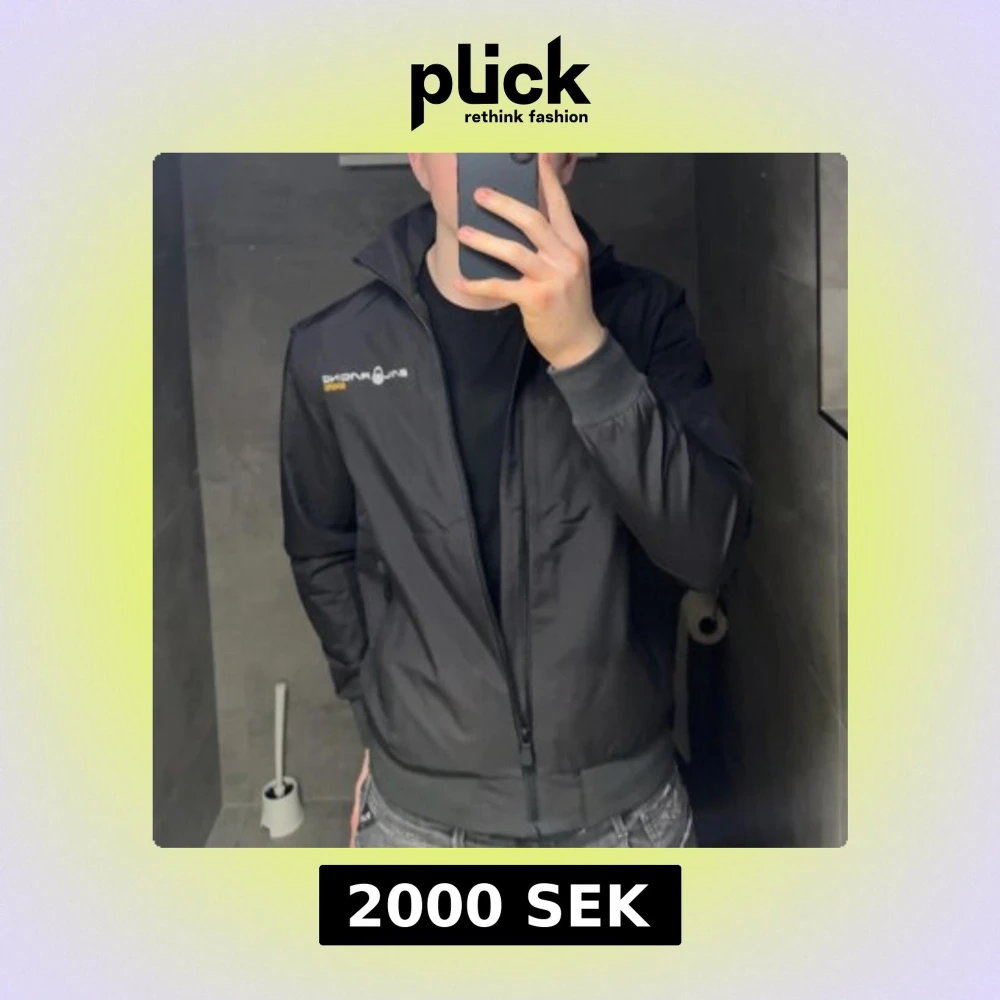 Svart vindjacka från Sail Racing med GORE-TEX-material. Jackan har dragkedja framtill, ståkrage och ribbade muddar. Diskreta loggor i vitt och gult på bröstet och ryggen. Köpte den på impuls och märkte att den var aningen för kort i armar och längd på 180 cm, 80 kg. Kostar 3-4 tusen ny.
