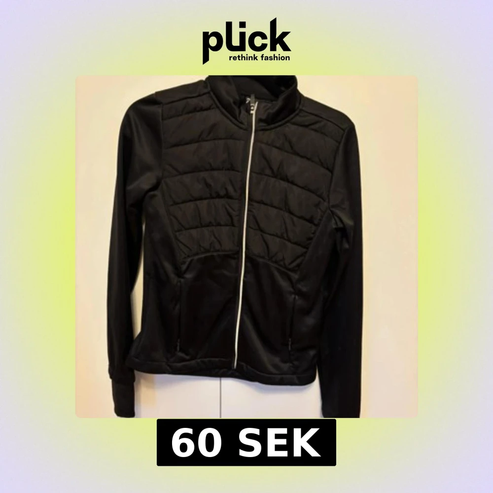Säljer en svart träningsjacka med quiltade partier framtill och hel dragkedja. Jackan har hög krage, långa ärmar och två fickor med dragkedja. Materialet är slätt och lätt, perfekt för utomhusaktiviteter. Reflekterande prickar baktill för extra synlighet.