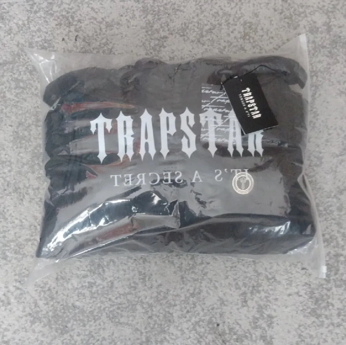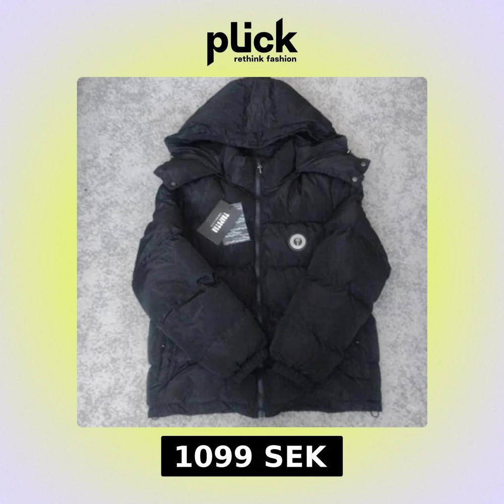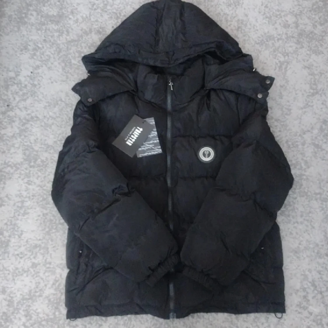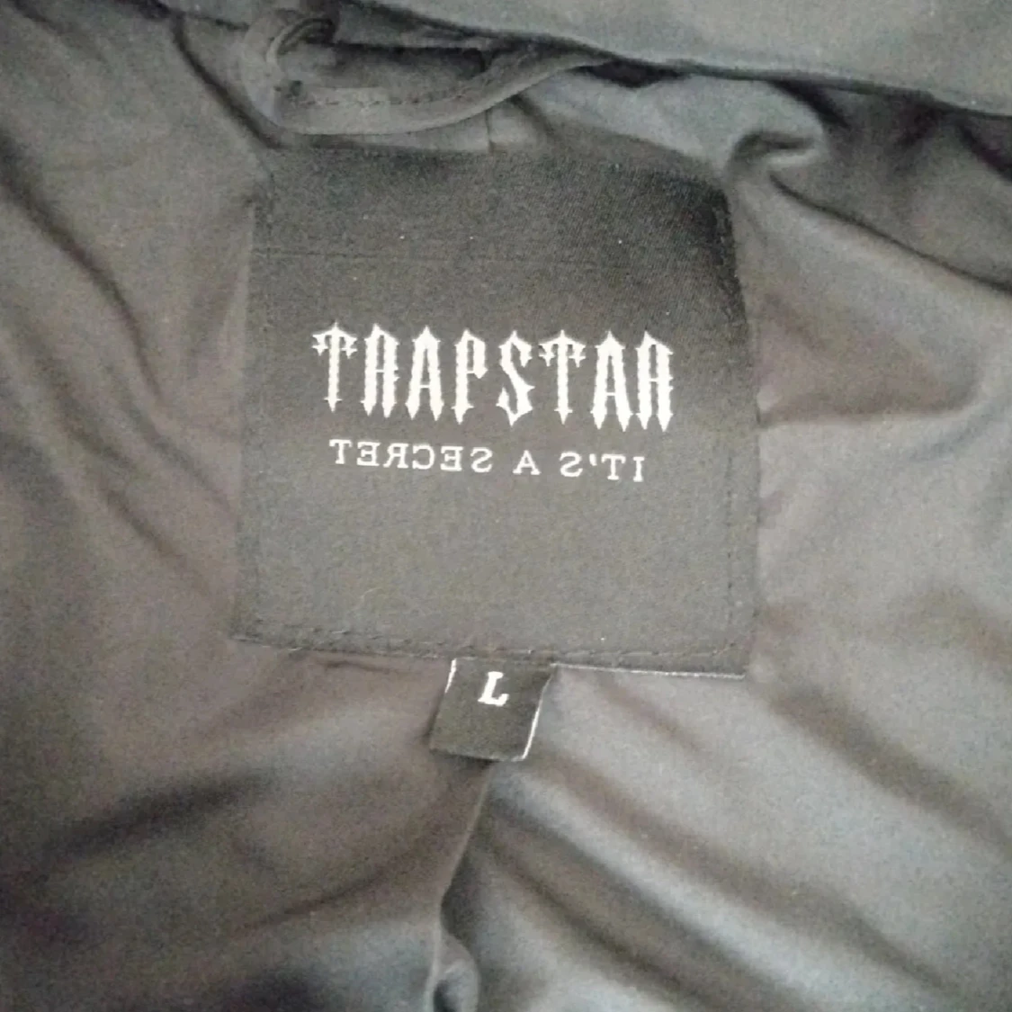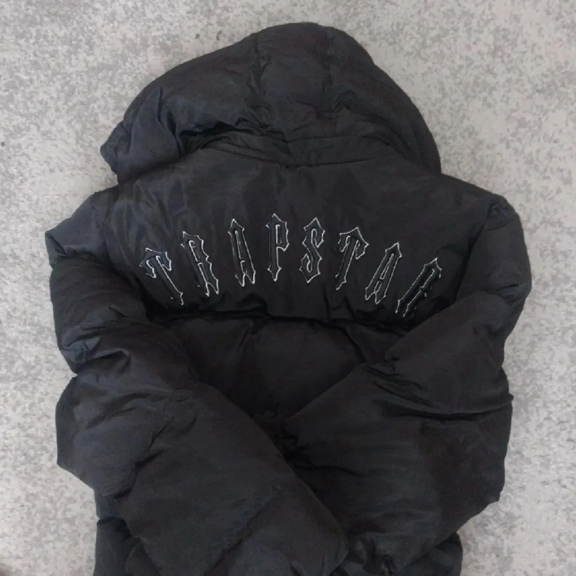 Svart pufferjacka från Trapstar med stor huva och dragkedja framtill. Jackan har broderad Trapstar-logga på ryggen och en rund patch på bröstet. Perfekt för kalla dagar. Snygg med tydlig branding.