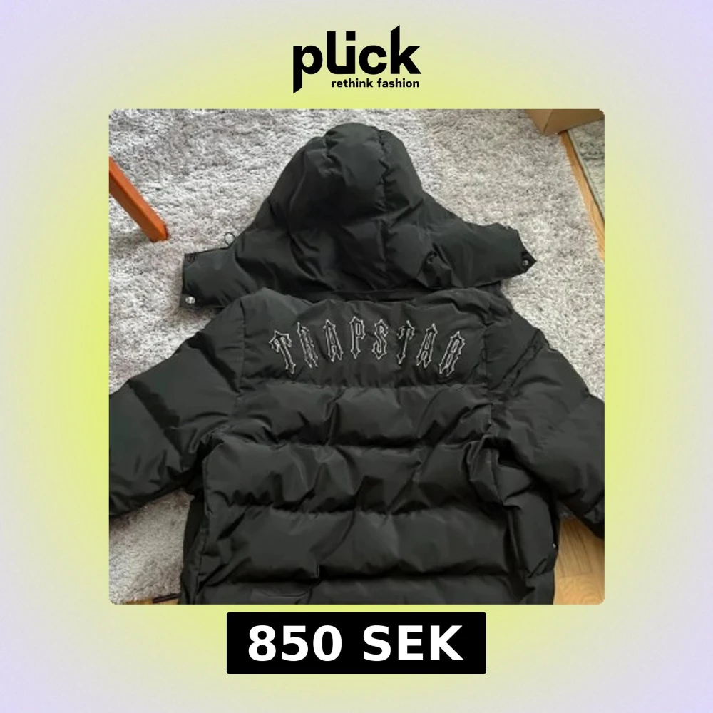 Säljer en svart pufferjacka från Trapstar med stor broderad logga på ryggen och rund logotyp på bröstet. Jackan har huva, dragkedja framtill och breda kanaler för en riktigt fet look. Perfekt för kalla dagar när du vill sticka ut. Ena fickan går ej att knäppa