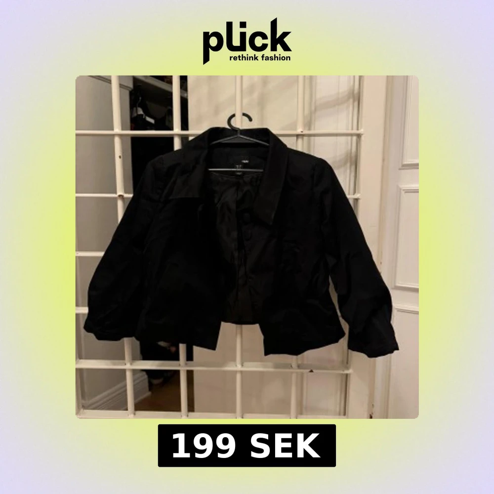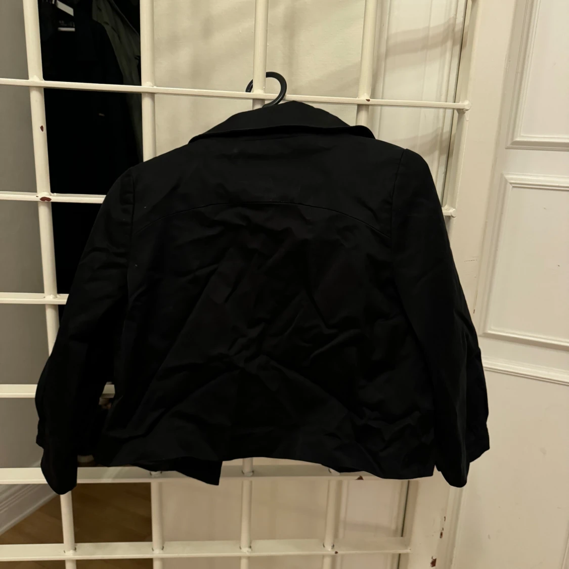 Snygg svart croppad jacka från H&M med klassisk krage och knappar framtill. Jackan är trekvartsärmad med en stilren look som passar till många outfits. Perfekt till skolan och hösten!