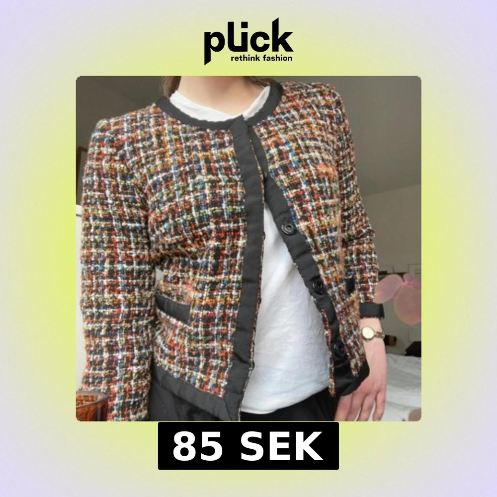 Snygg trekvartsärmad flerfärgad rutig kavaj/jacka med svarta detaljer och knappar. Perfekt för att ge en färgglad touch till din outfit.