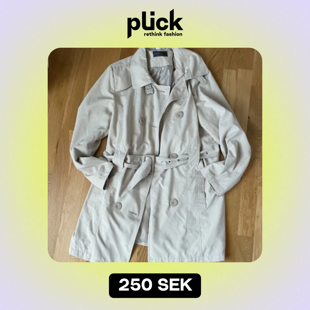 Beige trenchcoat i kortare modell, går strax ovanför knäna på mig som är 173 cm lång. Passar storlek S-M