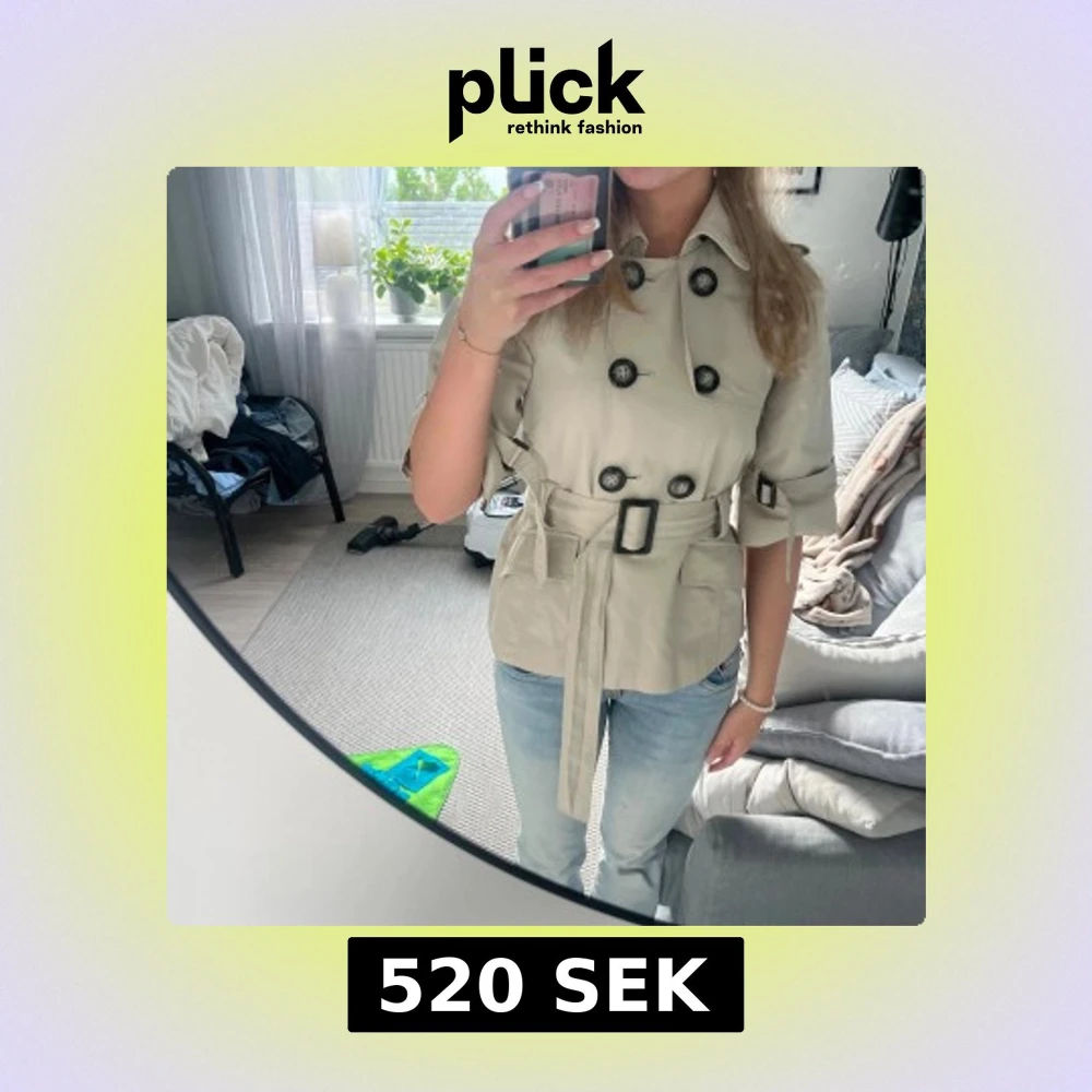 Snygg beige trenchcoat med korta ärmar, stora svarta knappar och bälte i midjan. Jackan har klassisk krage, fickor framtill och detaljerade spännen vid ärmarna. Perfekt för dig som vill ha en stilren och trendig look till våren eller hösten.