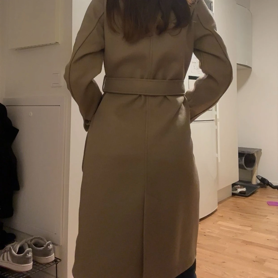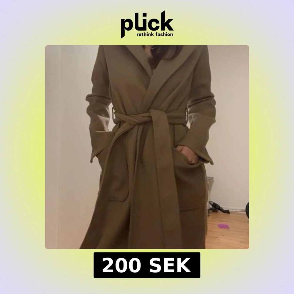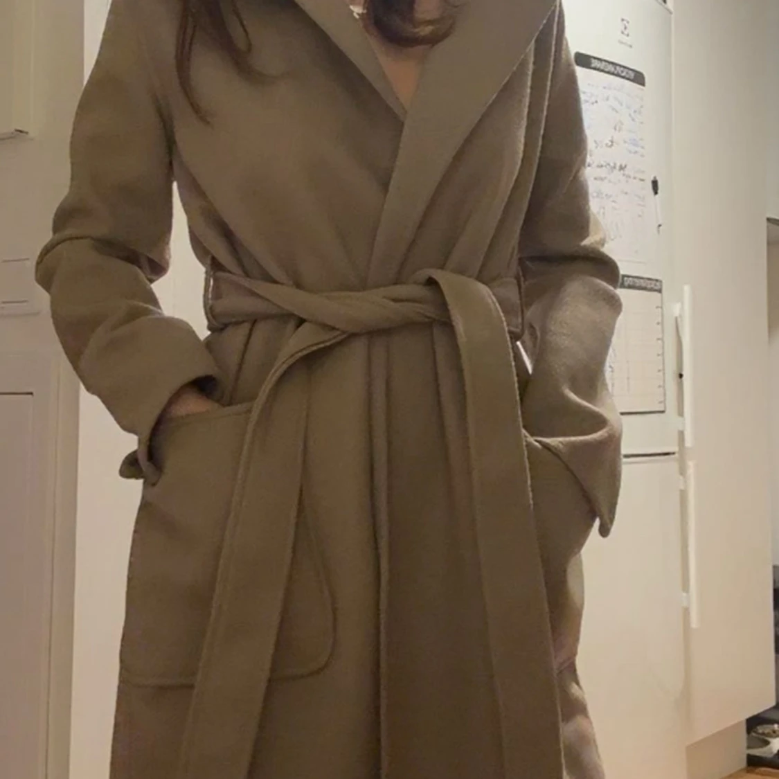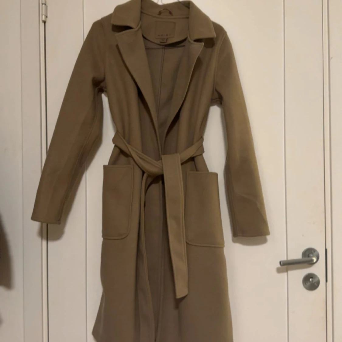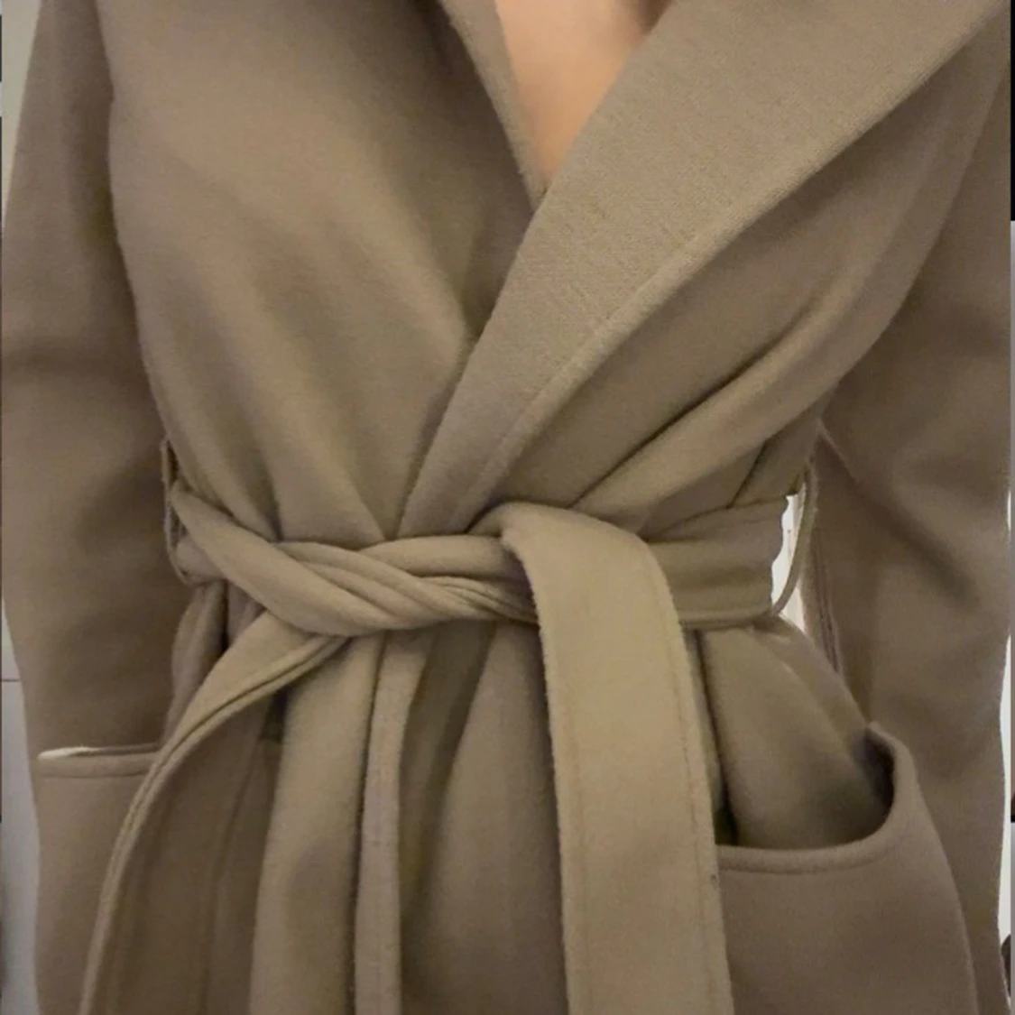 Snygg beige kappa med bred krage och knytskärp i midjan. Lång modell med stora, praktiska fickor framtill och markerad söm i ryggen. Storlek 34/XS (endast använd en gång)
