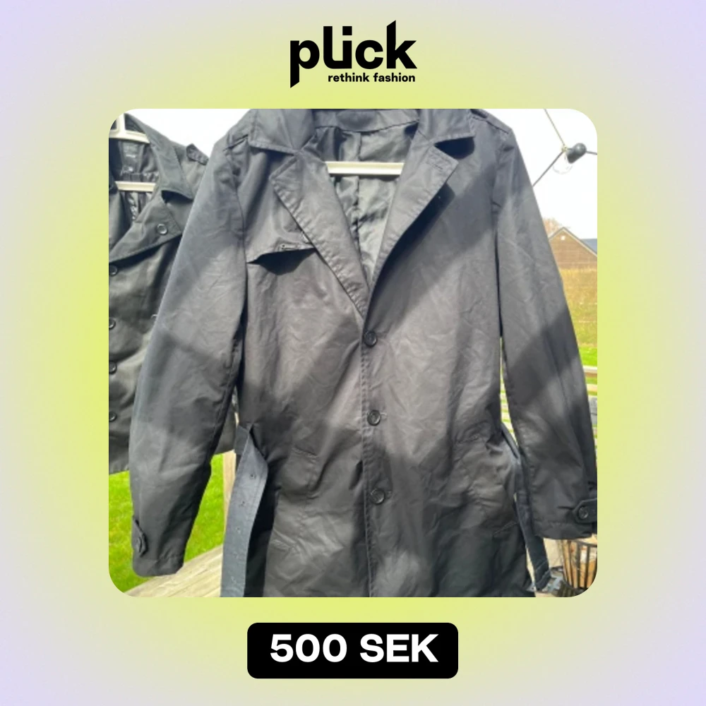 Trenchcoat från Riley. Mörkt blå, nästan svart. Jag är 175 cm och väger ca 75. Funkar nog med +-5 kg.