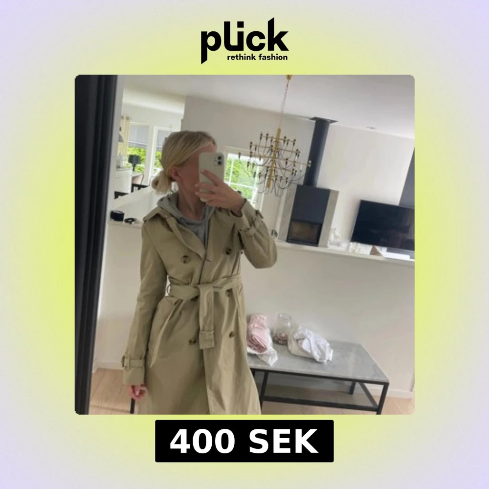 Stilren beige trenchcoat med klassisk krage, dubbelknäppning och bälte i midjan. Jackan har långa ärmar med spännen vid handlederna och slits bak.