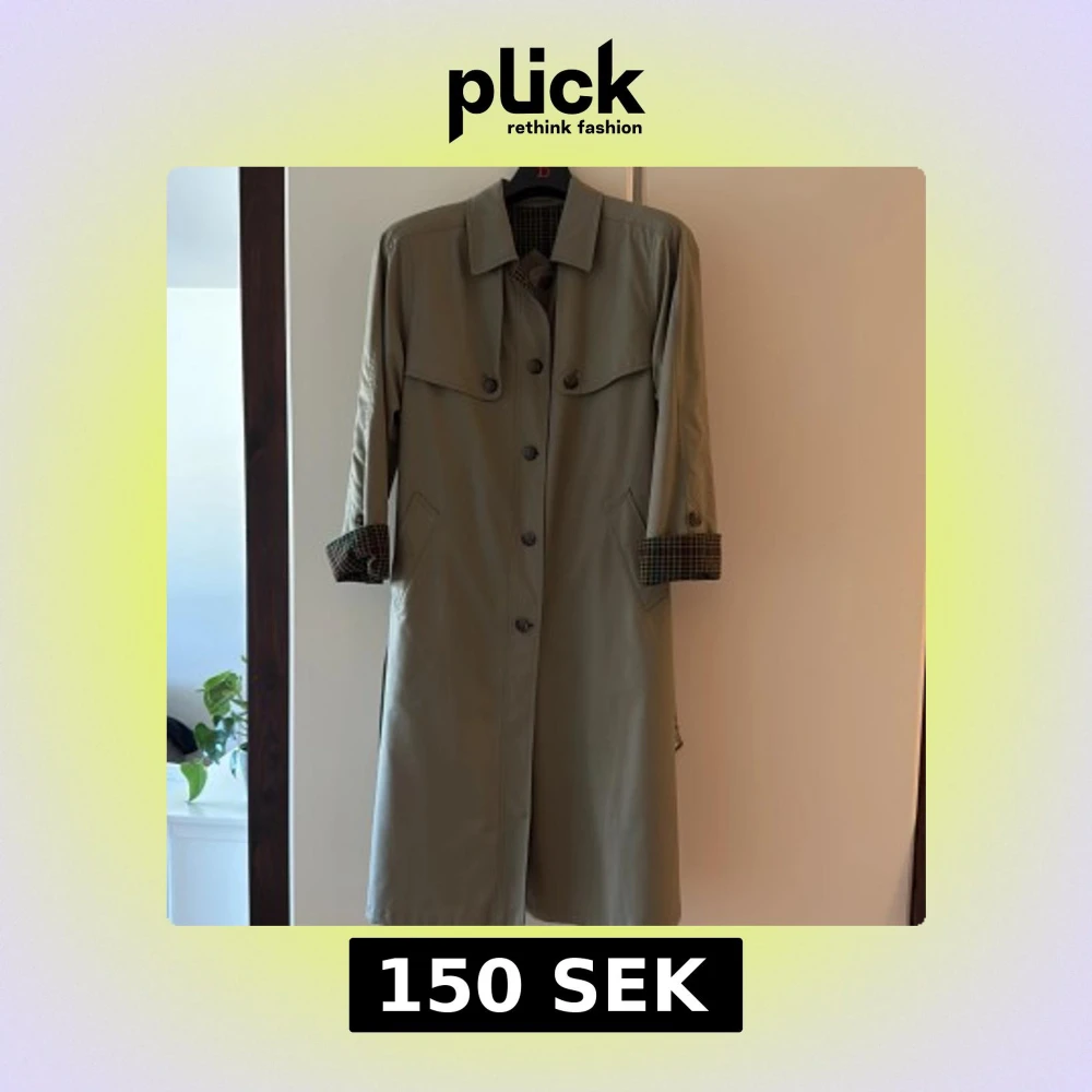 trenchcoat med klassisk krage, knappar framtill och rutigt foder. Den har bälte i midjan och uppvikta ärmar som visar fodret. Perfekt för dig som vill ha en tidlös och snygg look. I fint skick