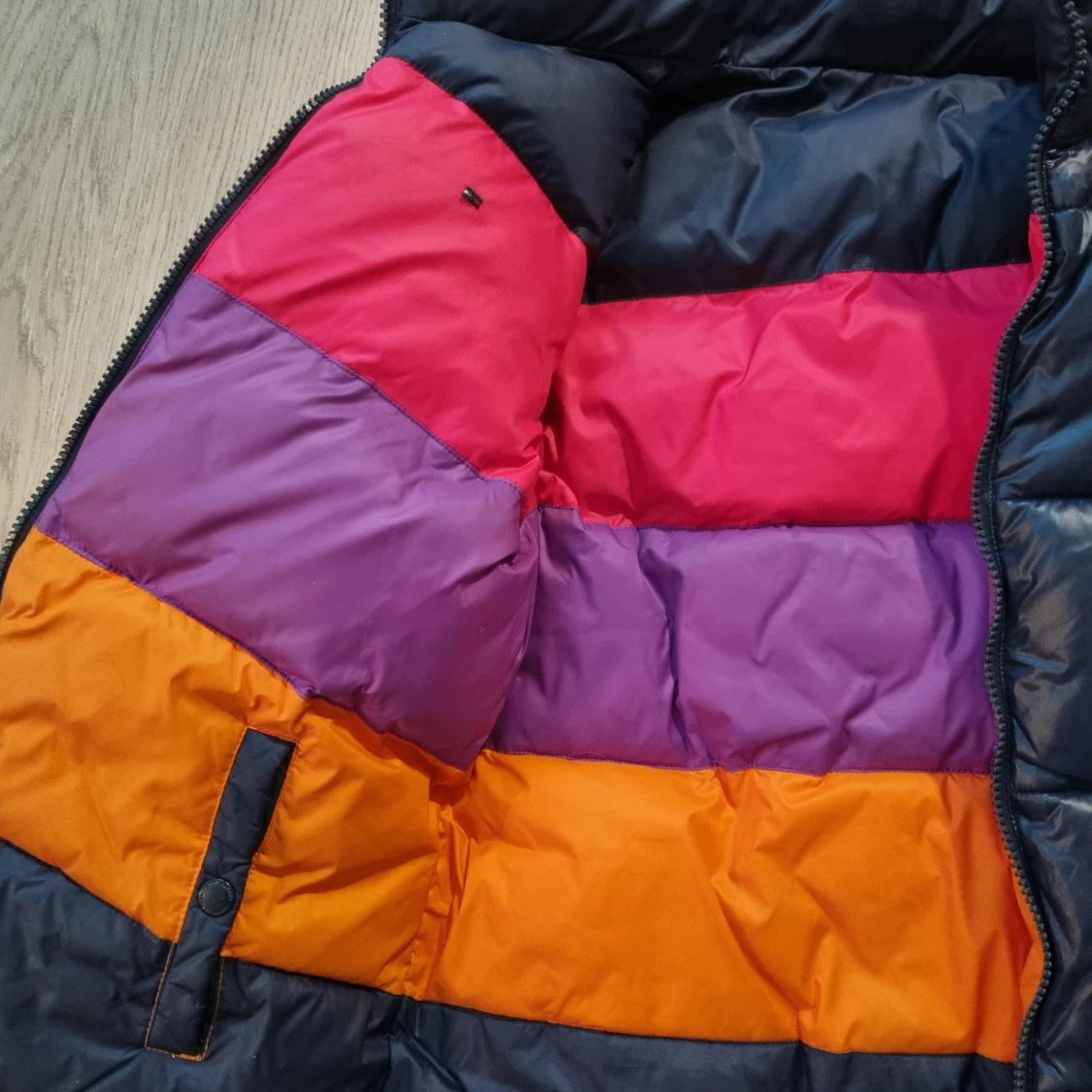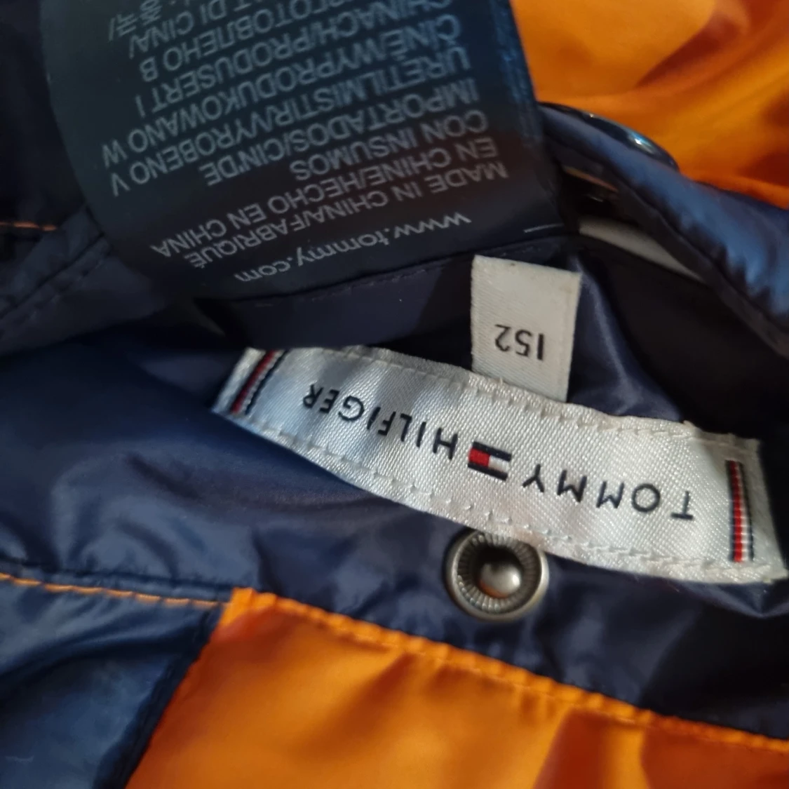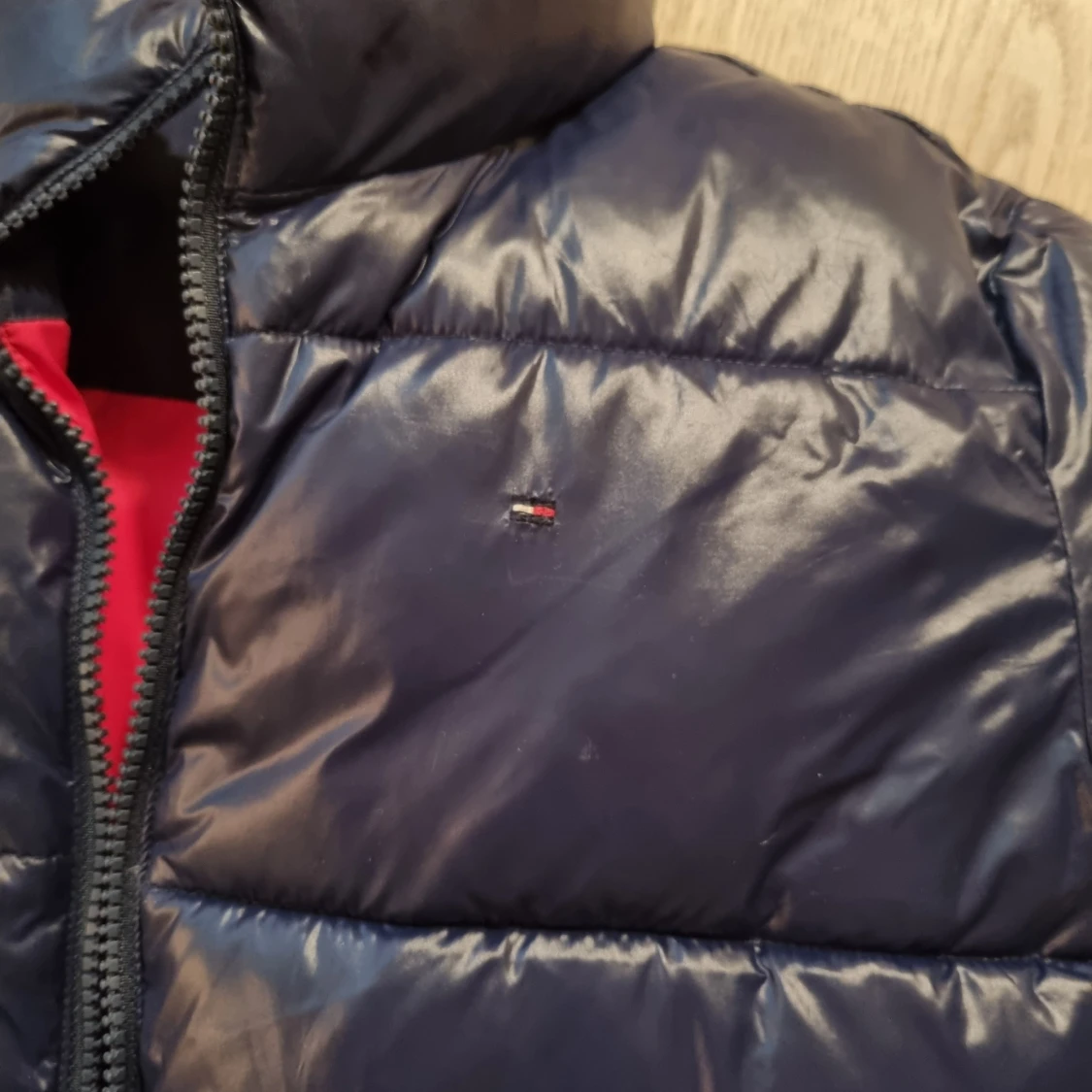 Snygg mörkblå pufferjacka från Tommy Hilfiger med dragkedja och hög krage. Jackan har märkets logga på bröstet och stor text på ryggen. Perfekt för kyliga dagar med sin vadderade design.
