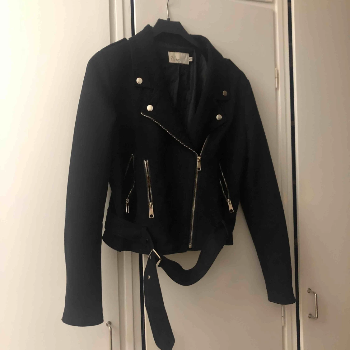 Jacka i mocka material med många detaljer som fickor och bältet nertill. Sitter som en storlek 40