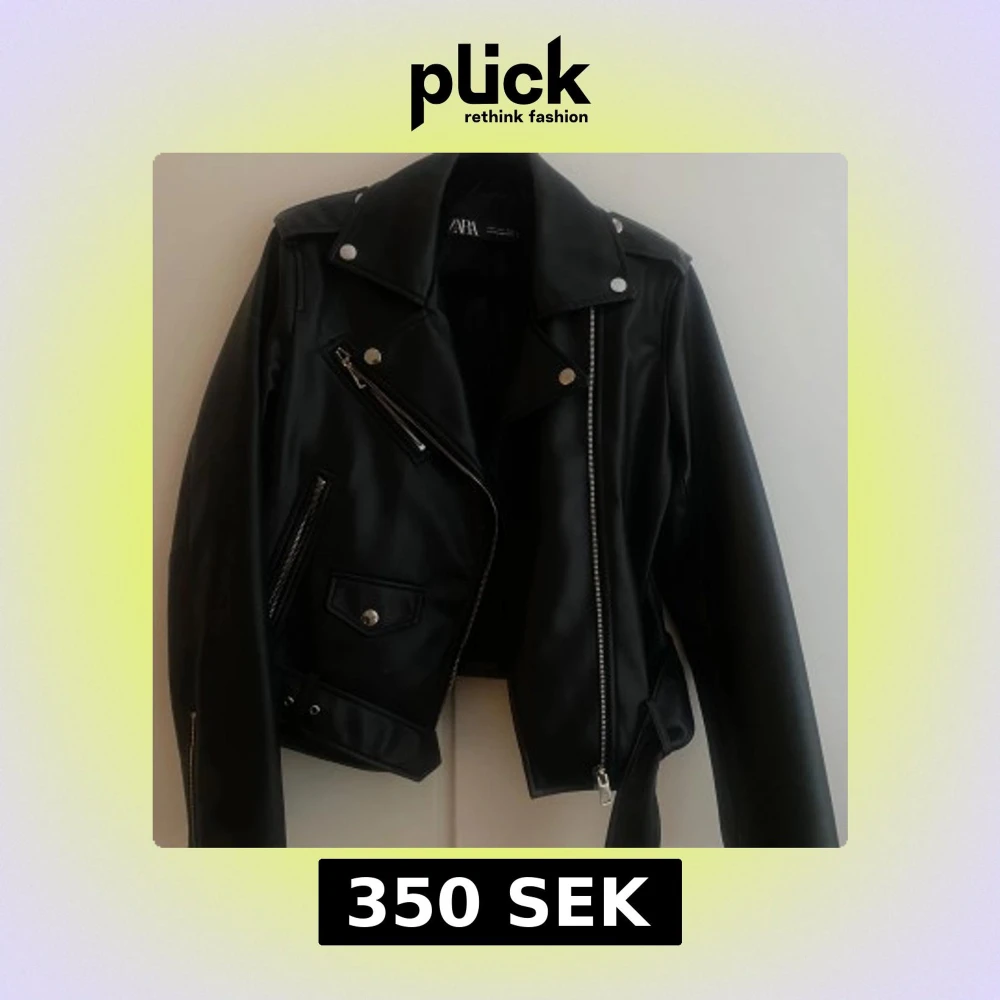 Säljer en svart skinnjacka från Zara med klassisk bikerstil. Jackan har silvriga dragkedjor, knappar och detaljer samt bälte i midjan. Snygg krage och flera fickor framtill. Perfekt för dig som vill ha en edgy look.