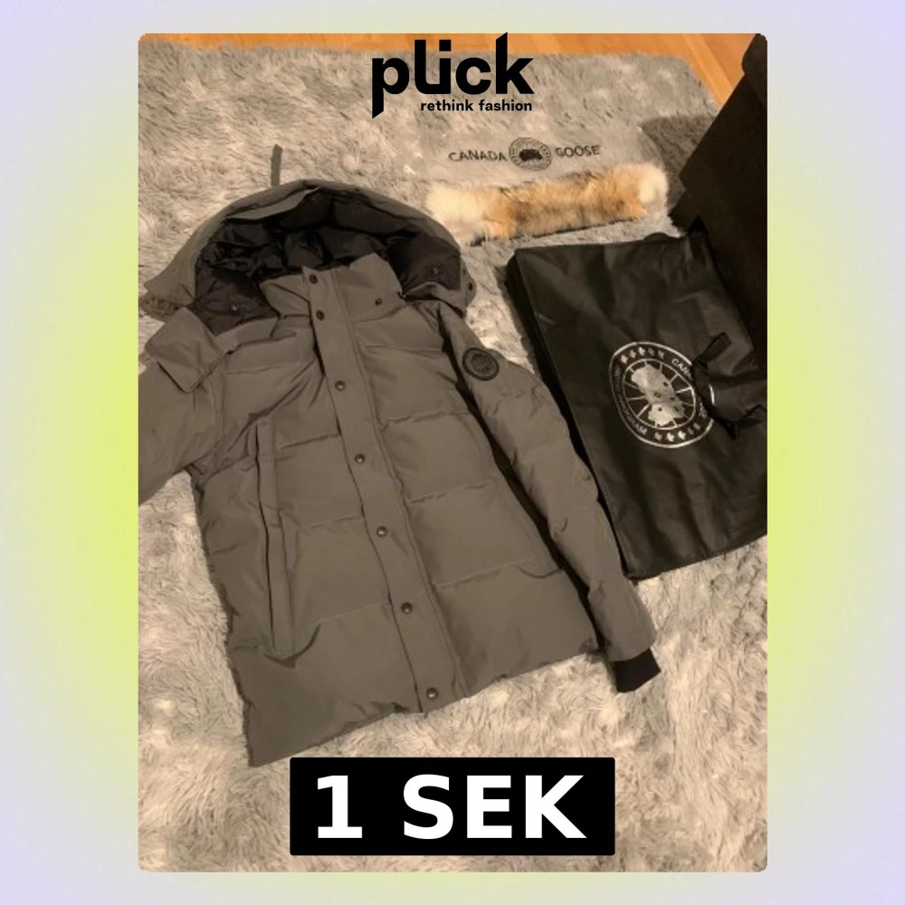 Kom med bud. Säljer en grå dunjacka från Canada Goose med avtagbar päls på huvan. Jackan har svart logotyp på ärmen, dragkedja och knappar framtill samt ribbade muddar. Perfekt för kalla vinterdagar och har en clean, modern look.