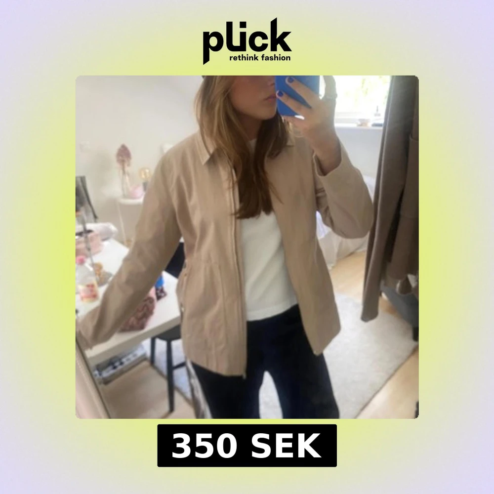 Säljer en stilren beige jacka från COS med dragkedja och tillhörande bälte i midjan. Jackan har lång ärm och klassisk krage, perfekt för vår och höst.