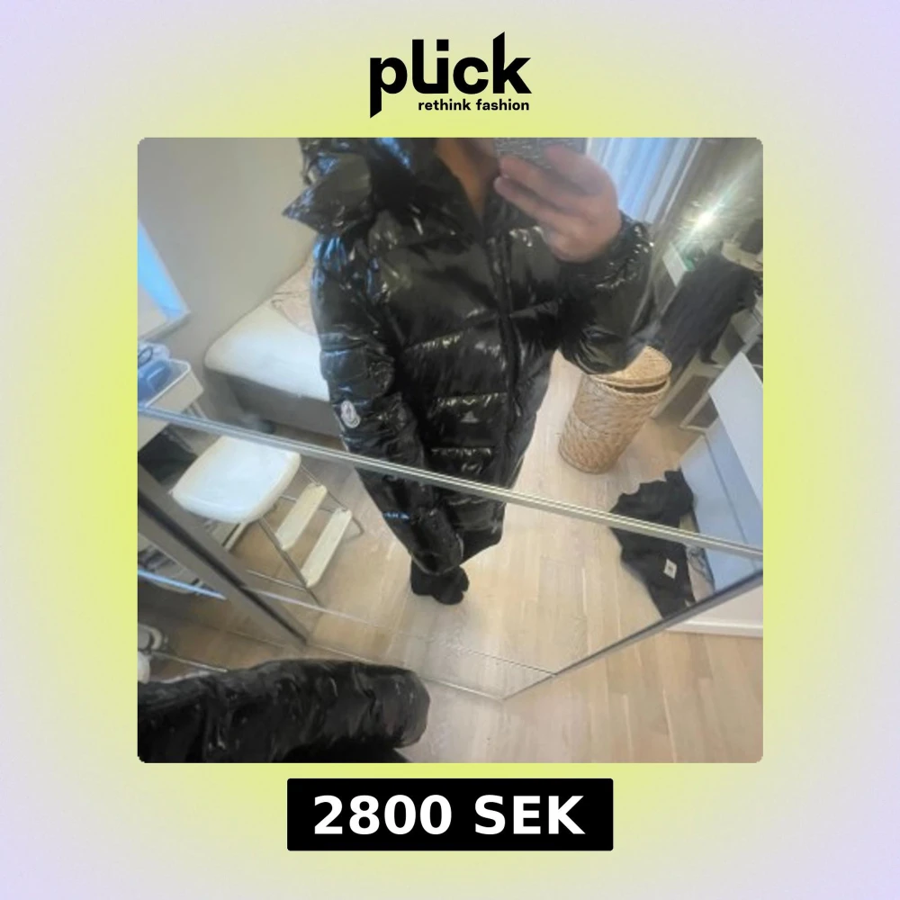 Säljer en snygg svart glansig dunjacka från Moncler. Den har en stor huva och dragkedja framtill. Perfekt för kalla vinterdagar när du vill hålla dig varm och stilren. Jackan är i mycket bra skick och passar perfekt för både vardag och festliga tillfällen. Den är lite trasig vid fickan, lätt att laga🥰
