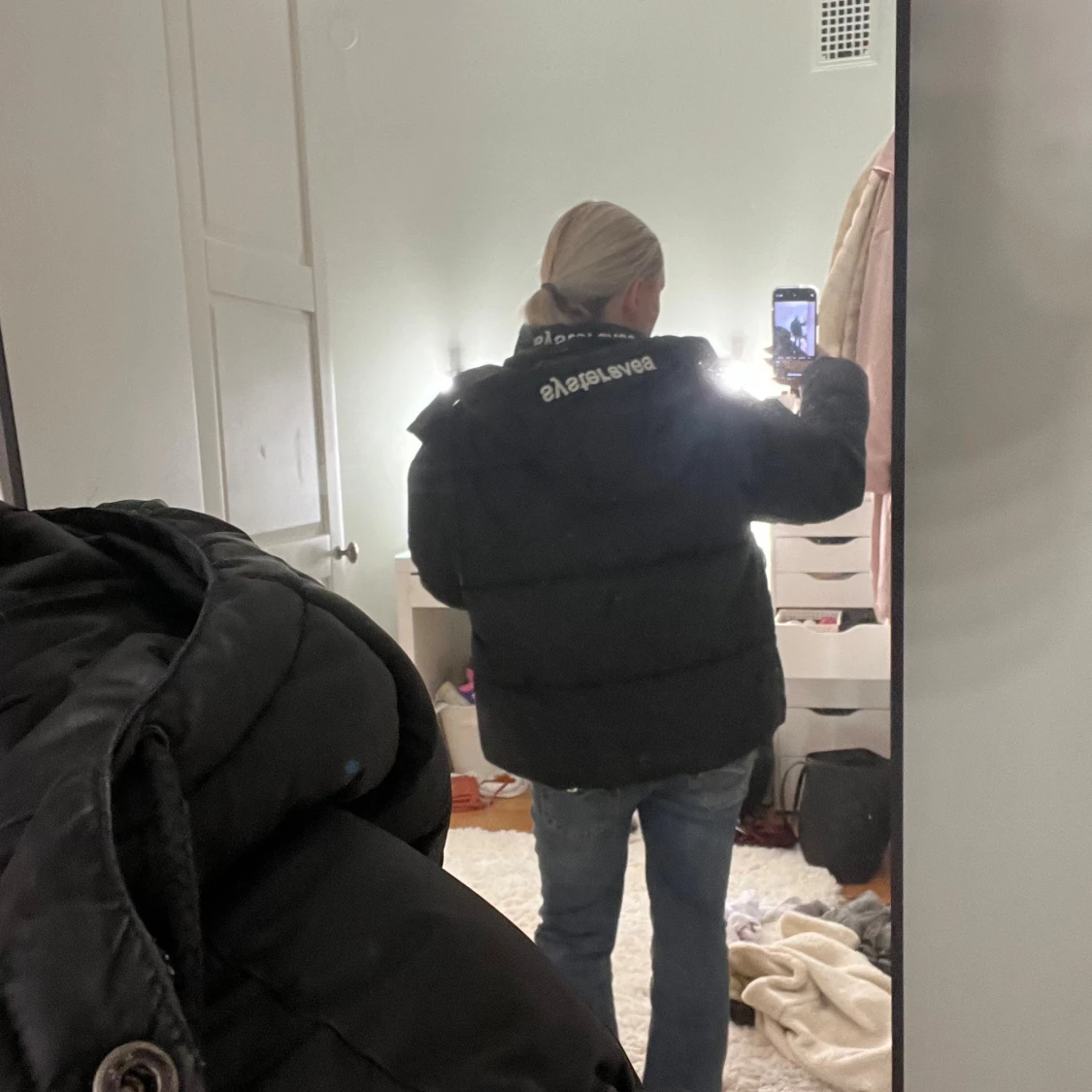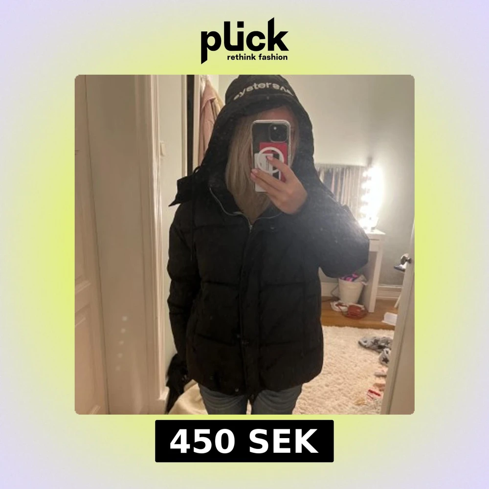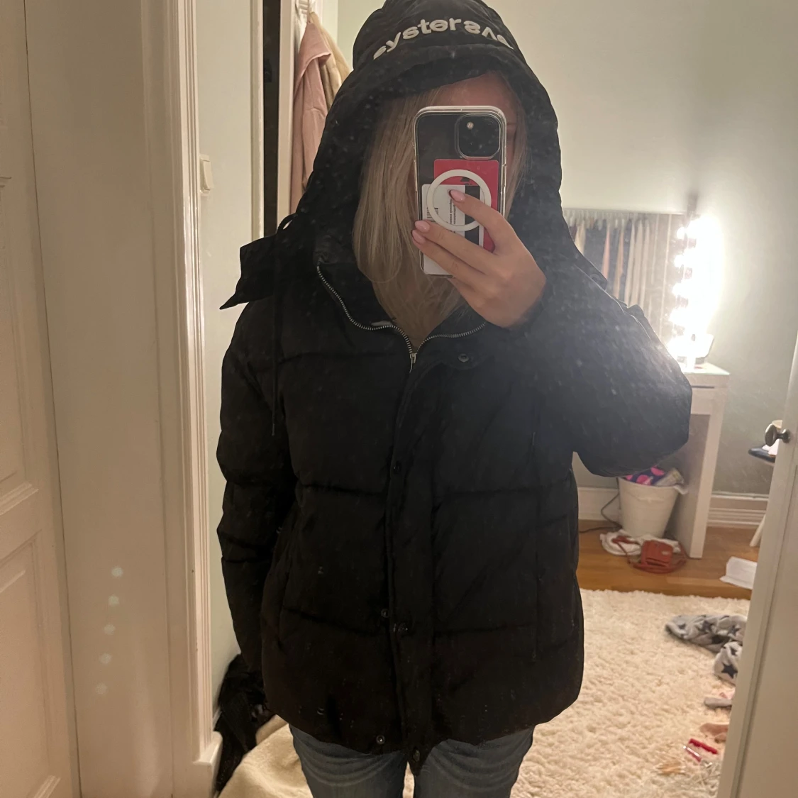 Säljer en svart pufferjacka från Svea med stor huva och logga på huvan. Jackan har dragkedja framtill och är riktigt varm och skön för kalla dagar. Har litet hål vid blixtlåsen