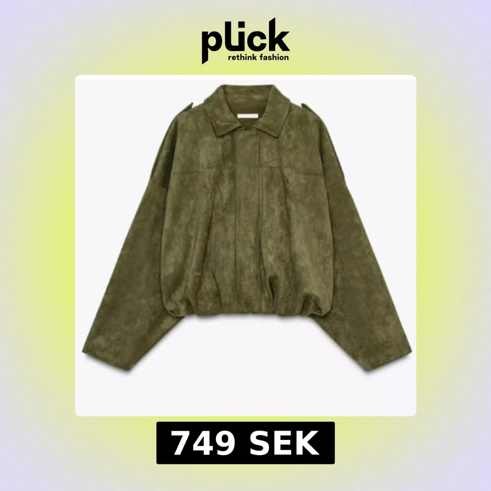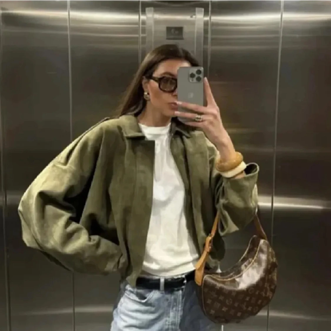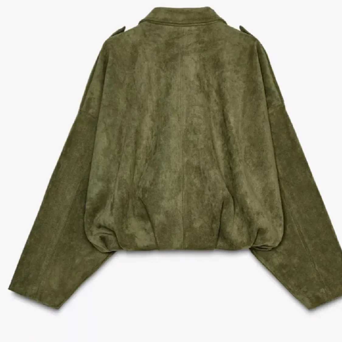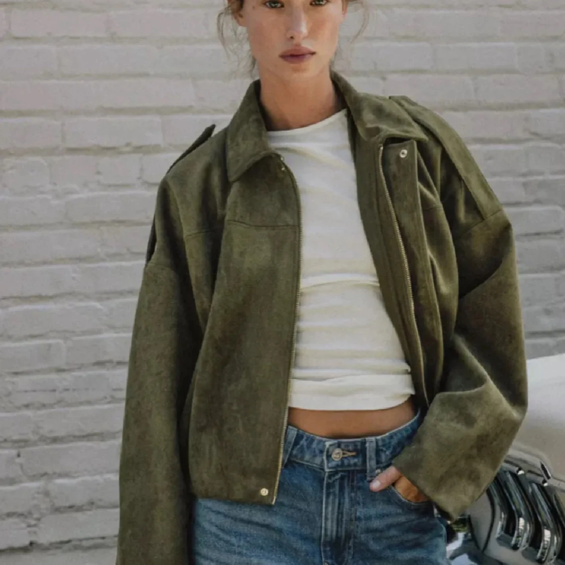 Säljer en olivgrön bomberjacka i mjuk mocka med oversized passform och klassisk krage. Jackan har långa ärmar, dragkedja framtill och coola axeldetaljer. Perfekt att styla med jeans och t-shirt för en chill look.