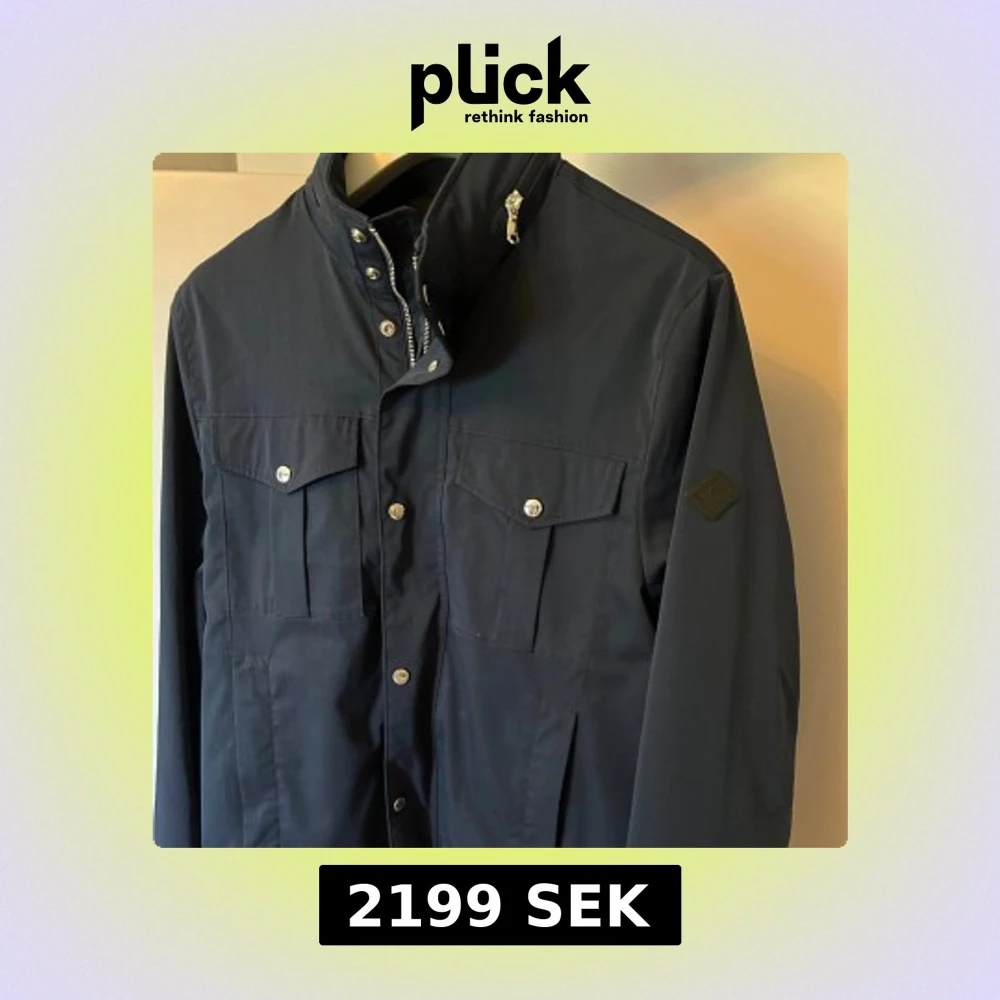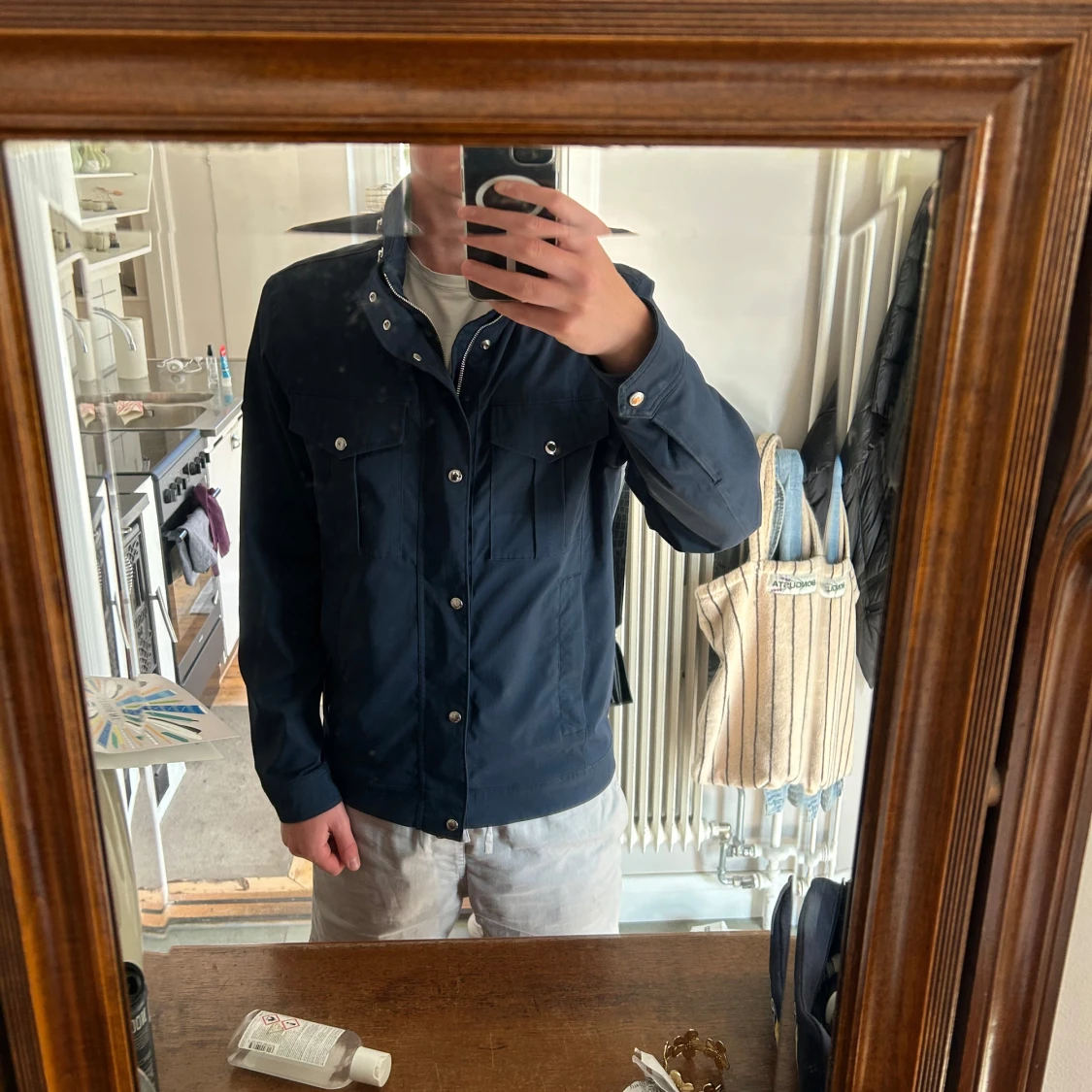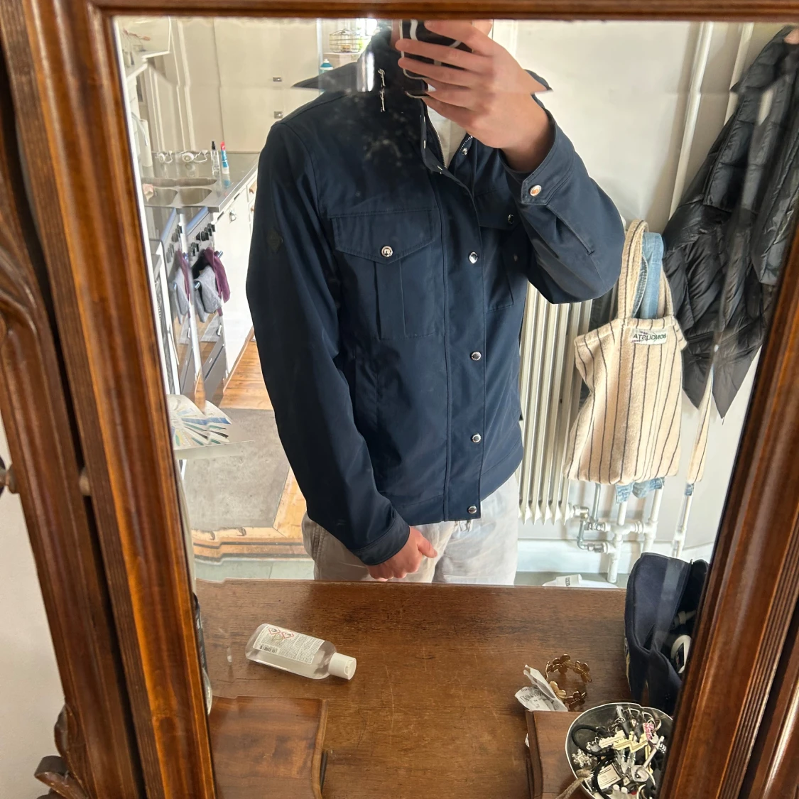 Snygg marinblå fieldjacket från J Lindeberg med hög krage, silverfärgade knappar och dragkedja. Jackan har två stora bröstfickor med lock och emblem på ärmen. Perfekt för dig som gillar stilren och funktionell design. Skick 8/10