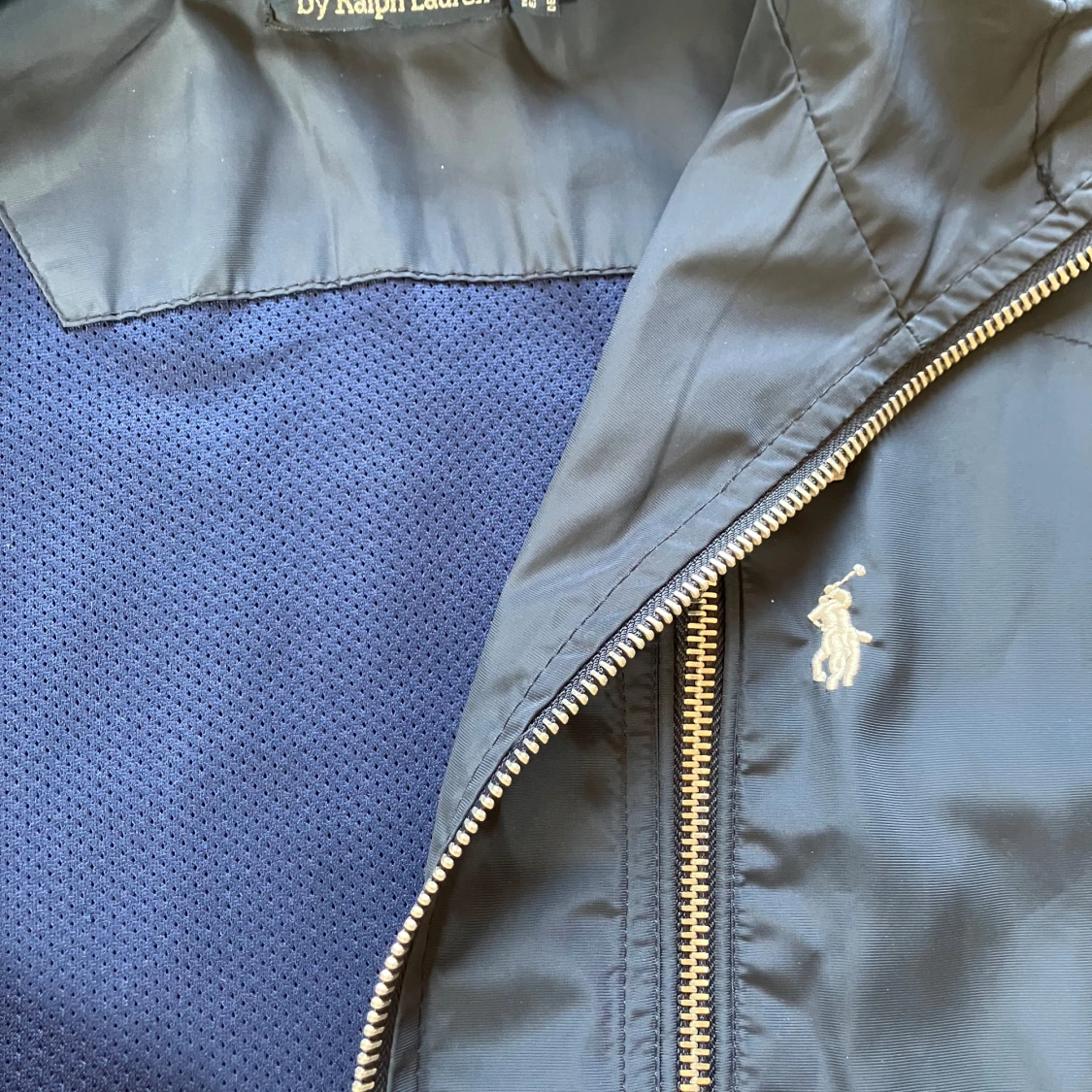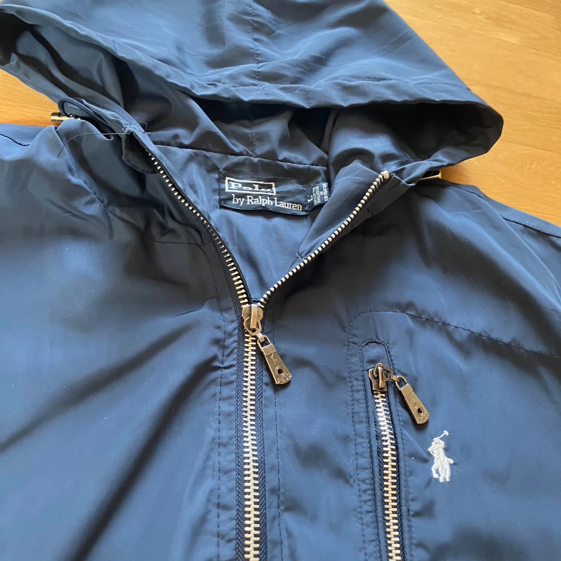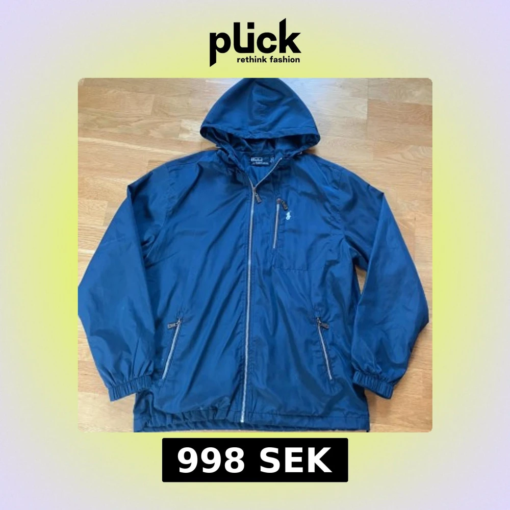 Snygg marinblå vindjacka från Polo Ralph Lauren med huva, dragkedja framtill och tre fickor med dragkedja. Jackan har meshfoder på insidan och klassisk logga broderad på bröstet. Perfekt för dig som gillar stilren och klockren look. Kvalitet: 10/10, inga synliga defekter. Storlek L men passar M perfekt.