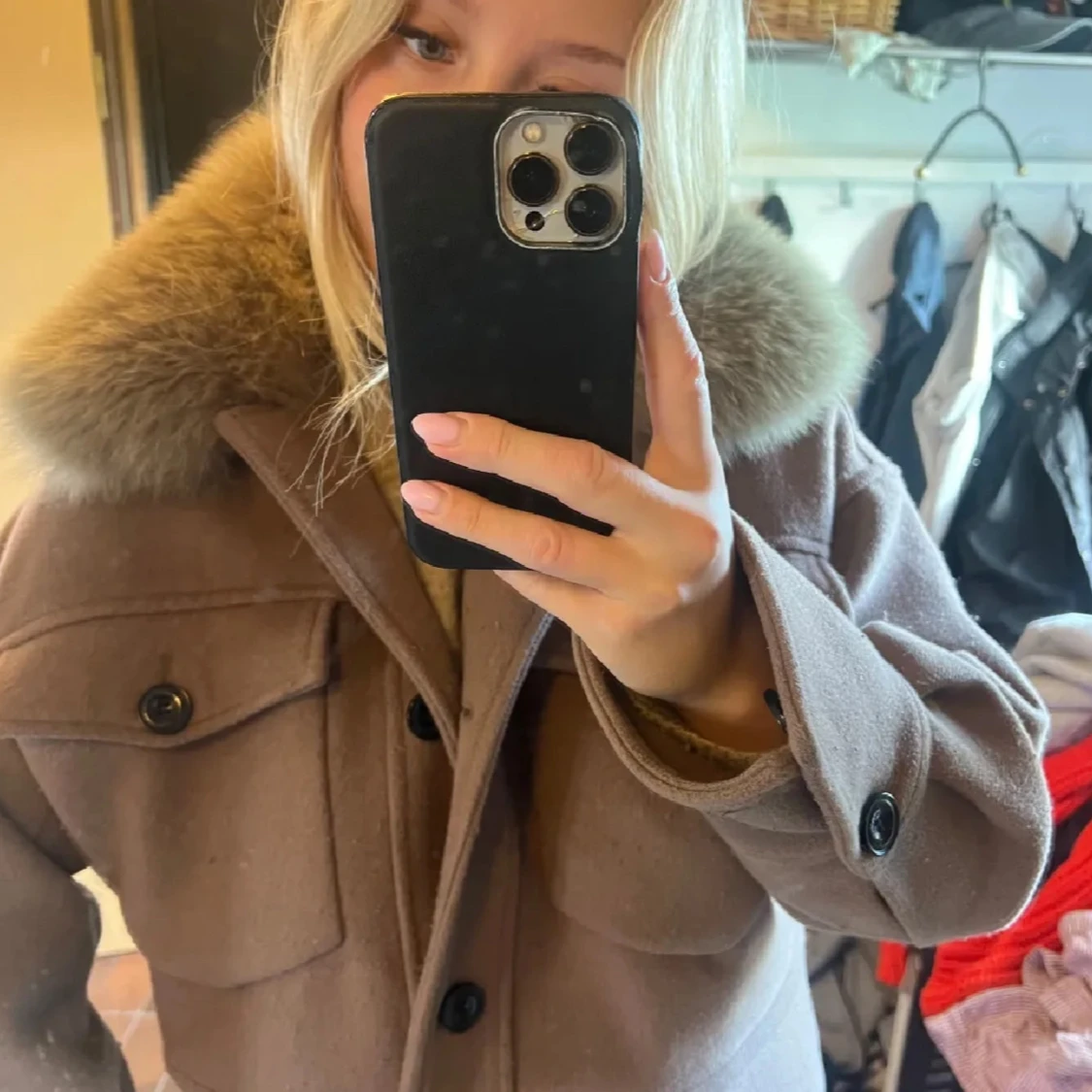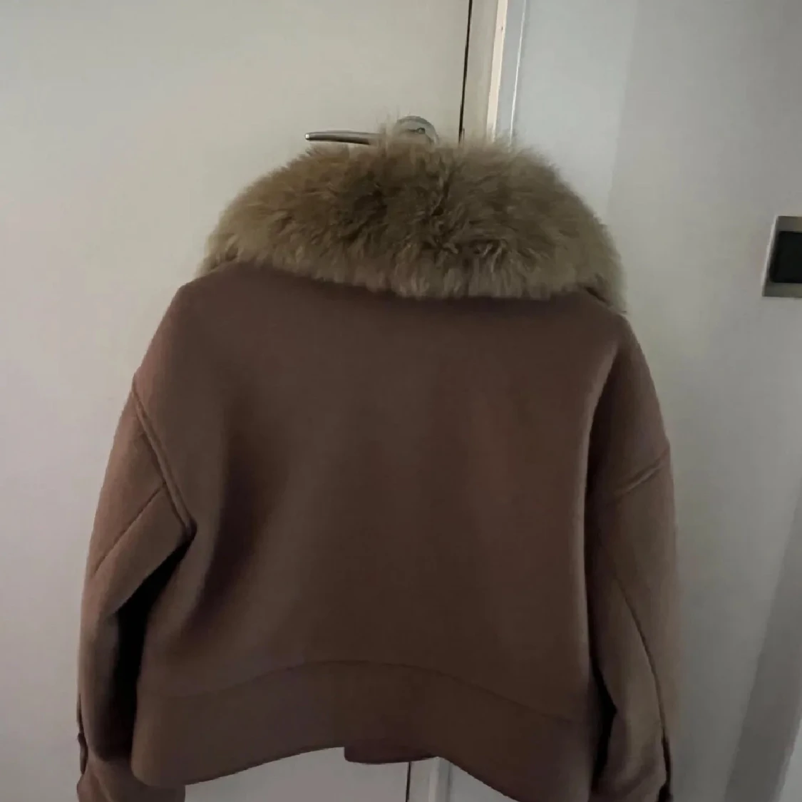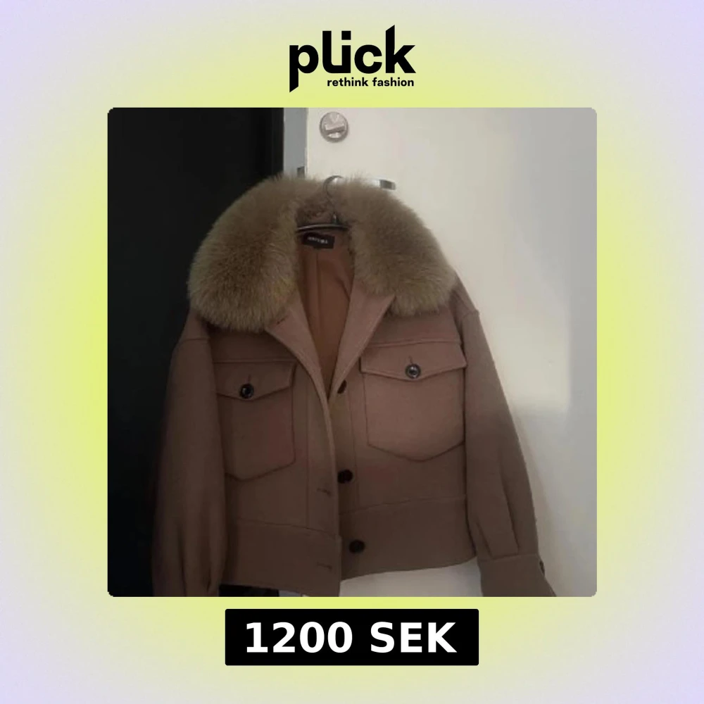 Säljer en beige jacka från Meotine med stor fluffig pälsig krage. Jackan har två stora bröstfickor med knappar, markerade axlar och knäppning framtill.
