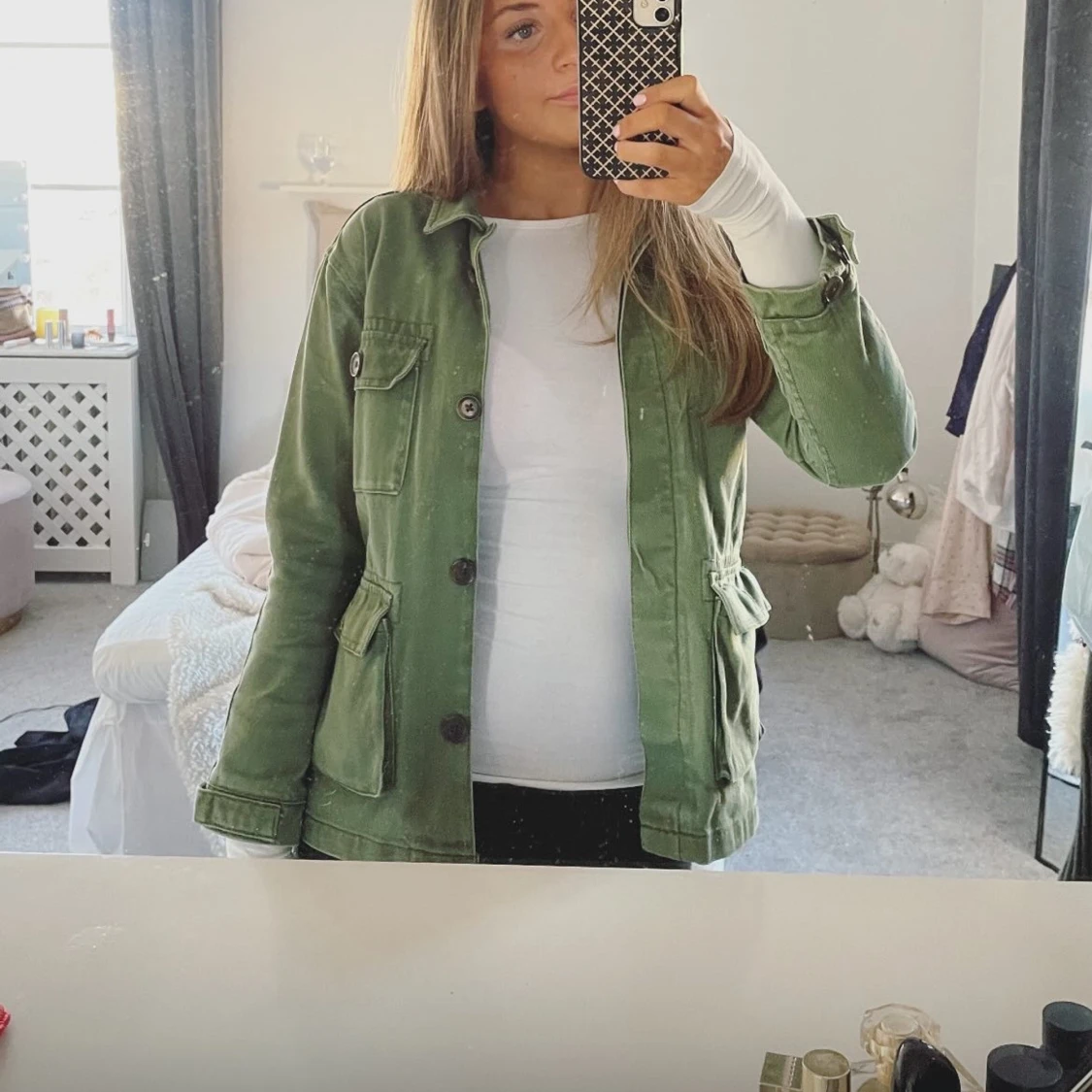 Snygg grön jacka med knappar framtill och praktiska fickor. Perfekt för en avslappnad stil. Jackan har långa ärmar och en normal passform.