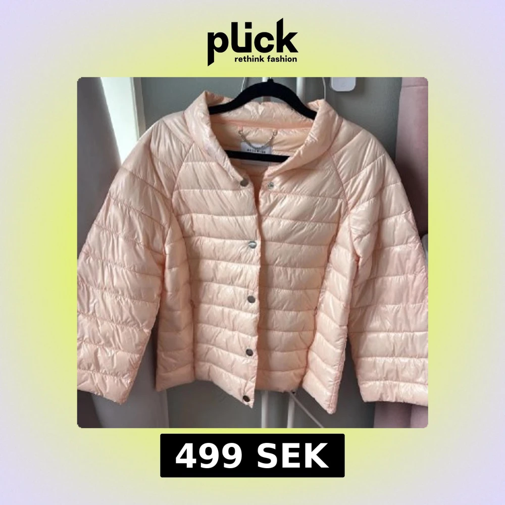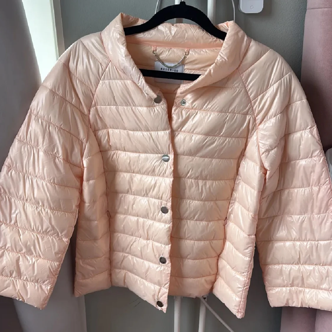 Säljer en ljusrosa pufferjacka med tryckknappar framtill. Jackan har en boxig passform och är quiltad med horisontella sömmar. Perfekt för dig som gillar en lätt och trendig jacka med lite glansig finish.