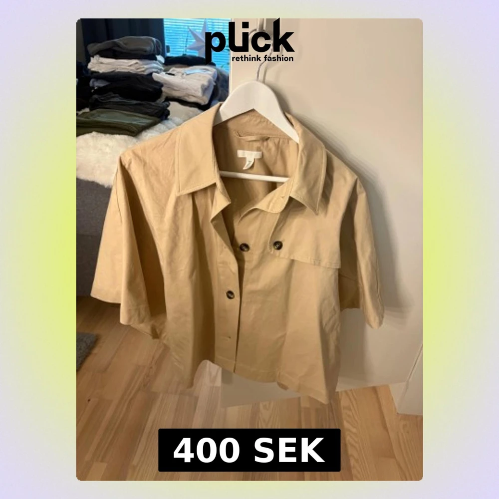 Snygg beige trenchcape från H&M med korta ärmar och oversized passform. Skjortan har klassisk krage, stora knappar framtill och en cool detalj med extra lager på ryggen. Perfekt att slänga över en hoodie för en chill look.