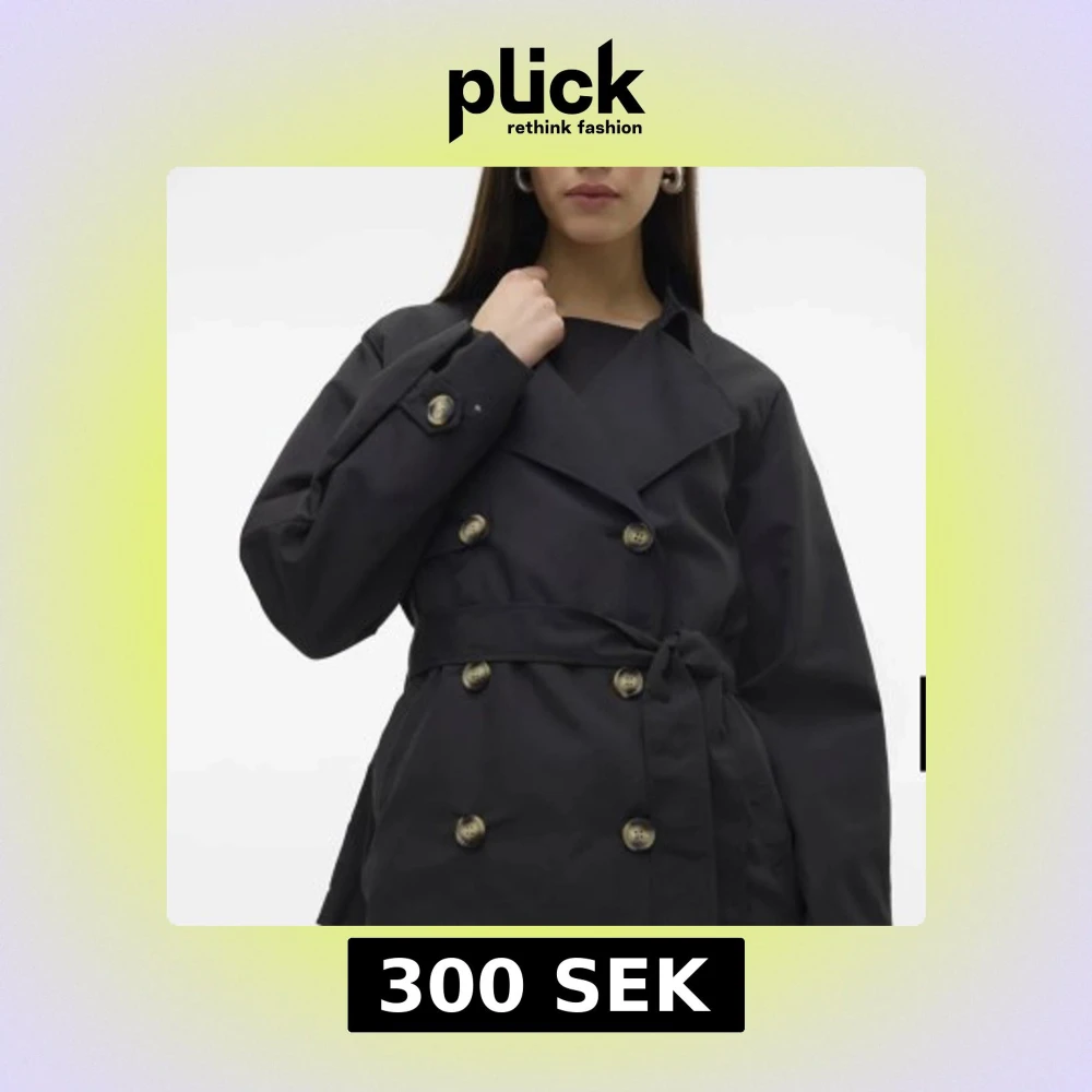 Snygg svart trenchcoat från Vera Moda med knappar och bälte i midjan. Jackan har långa ärmar och en klassisk krage. Perfekt för en stilren look. Jackan är i bra skick , inget fel med den alls.