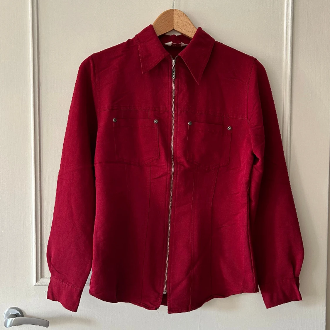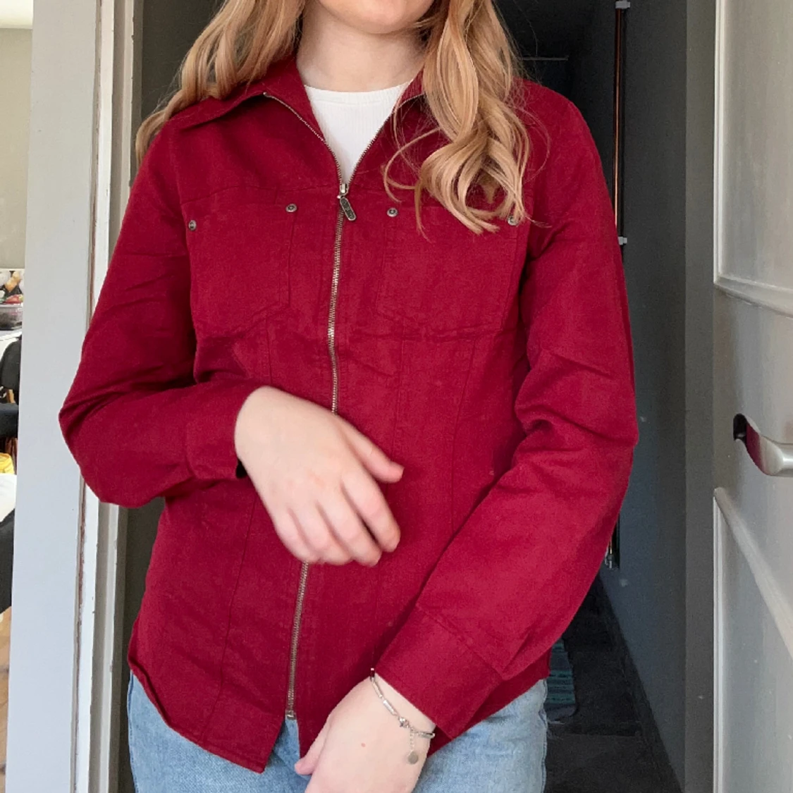 Röd väldigt tunn jacka, har själv fått den till skänks från en vän men har aldrig använt den. Snygg till t.ex en vit t-shirt!