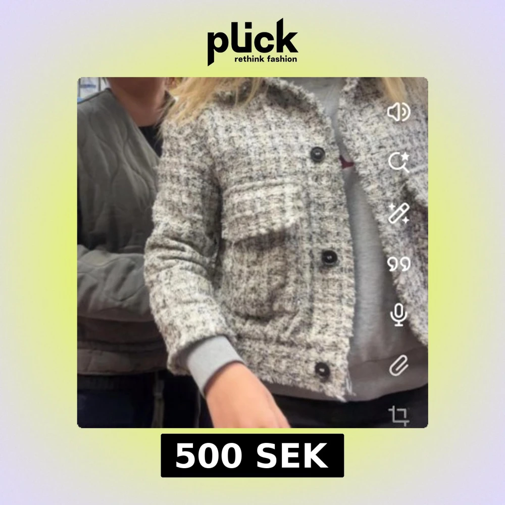 Säljer en snygg tweedinspirerad kavajjacka i grå och vit mix med svarta knappar och stora fickor framtill. Jackan har en boxig passform och är tillverkad i ett grovt, strukturerat material som ger en cool och trendig look . Från stella McCartney