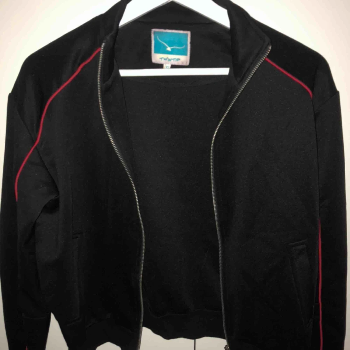 Riktigt cool träningsjacka men även bomberjacka! Röda linjer längst armarna och har användas av mig fåtal gånger till vardags.