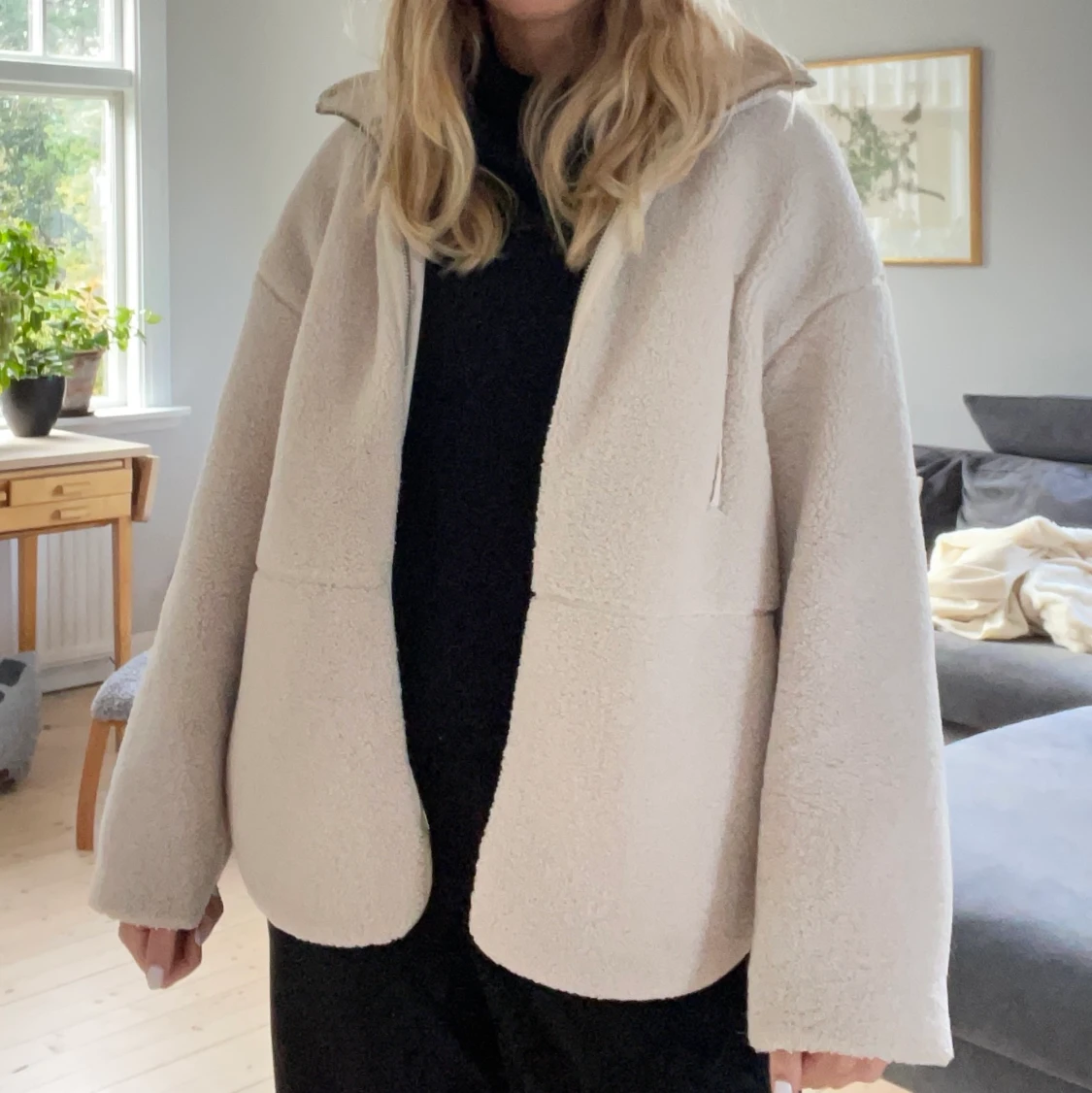 Ullig jacka från H&M. (Inte äkta ull) Bra skick och lagom varm för höst/vår men har även haft den på vintern med en tjocktröja under. Nyansen är vit med lite beigt inslag.