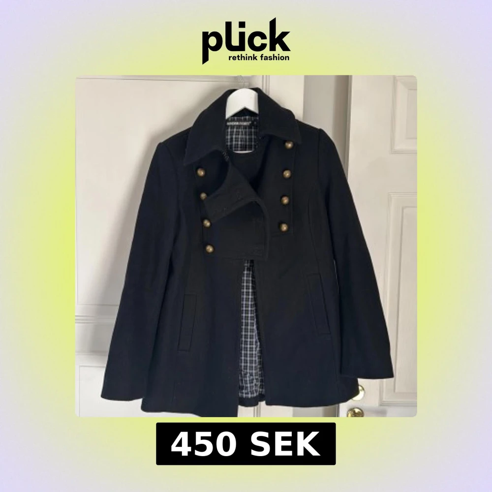 Säljer en svart skepparkavaj från Dr Denim i storlek S. Jackan har dubbelknäppning med stora guldfärgade knappar och hög krage. Insidan är fodrad med rutigt tyg i svart, vitt och blått. Perfekt för dig som gillar en stilren och edgy look. Cool och annorlunda ulljaxka med öppning framtill.