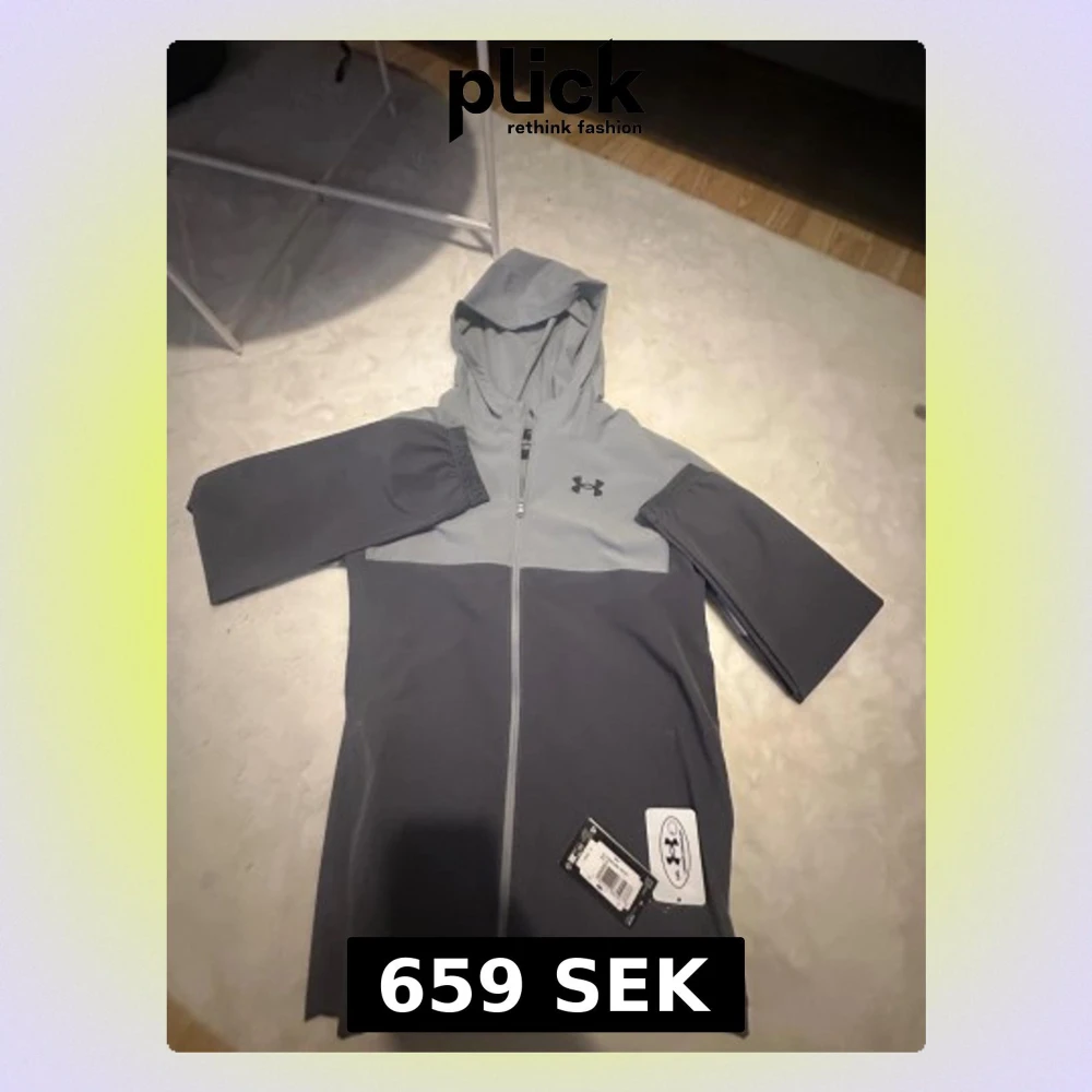 Snygg tvåtonad grå vindjacka från Under Armour med huva och hel dragkedja framtill. Jackan har långärmade ärmar och logga på bröstet. Perfekt för träning eller chill dagar ute. Modern och sportig look med stilren design.