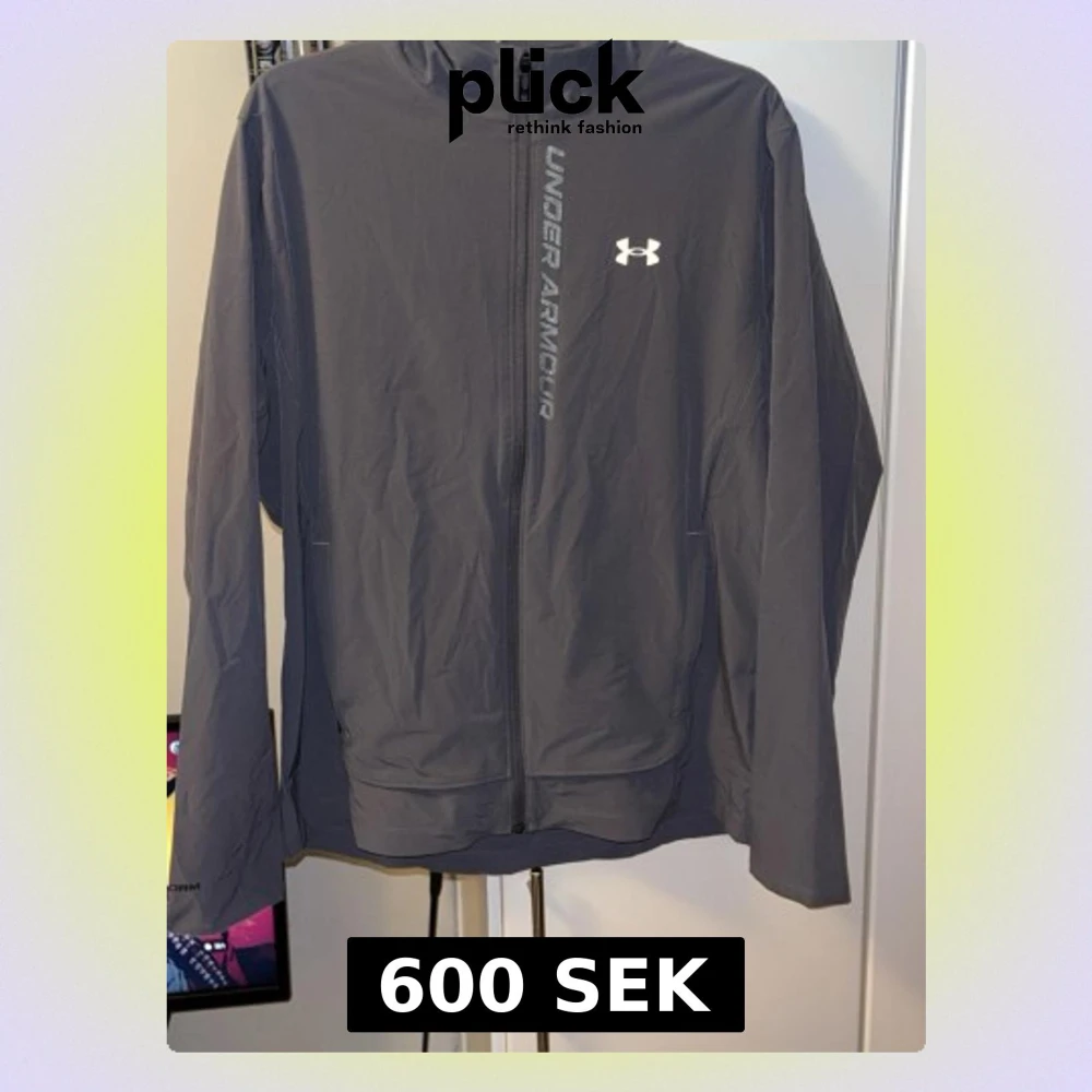 Säljer en grå vindjacka från Under Armour med huva och dragkedja framtill. Jackan har logga och text på bröstet, samt ventilerande meshfoder på insidan. Perfekt för träning utomhus när det blåser. Snygg och sportig look!