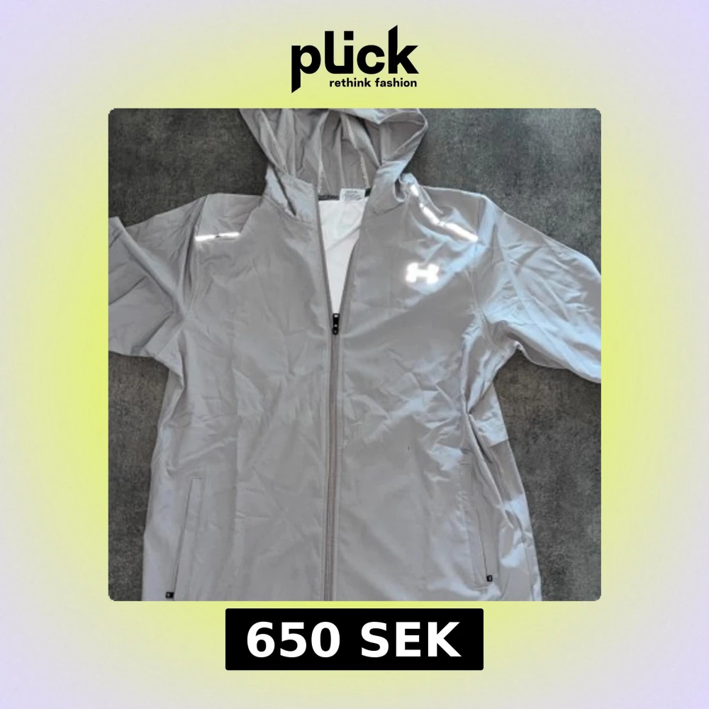 Snygg grå vindjacka från Under Armour med huva och hel dragkedja. Jackan har reflekterande logga fram och stor reflekterande text bak. Tillverkad i lätt polyester, perfekt för aktiva dagar. Fickor med dragkedja och lång ärm för extra funktion.