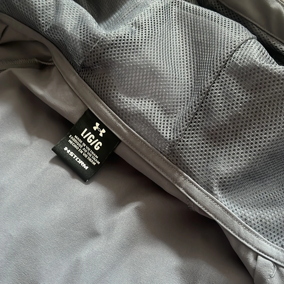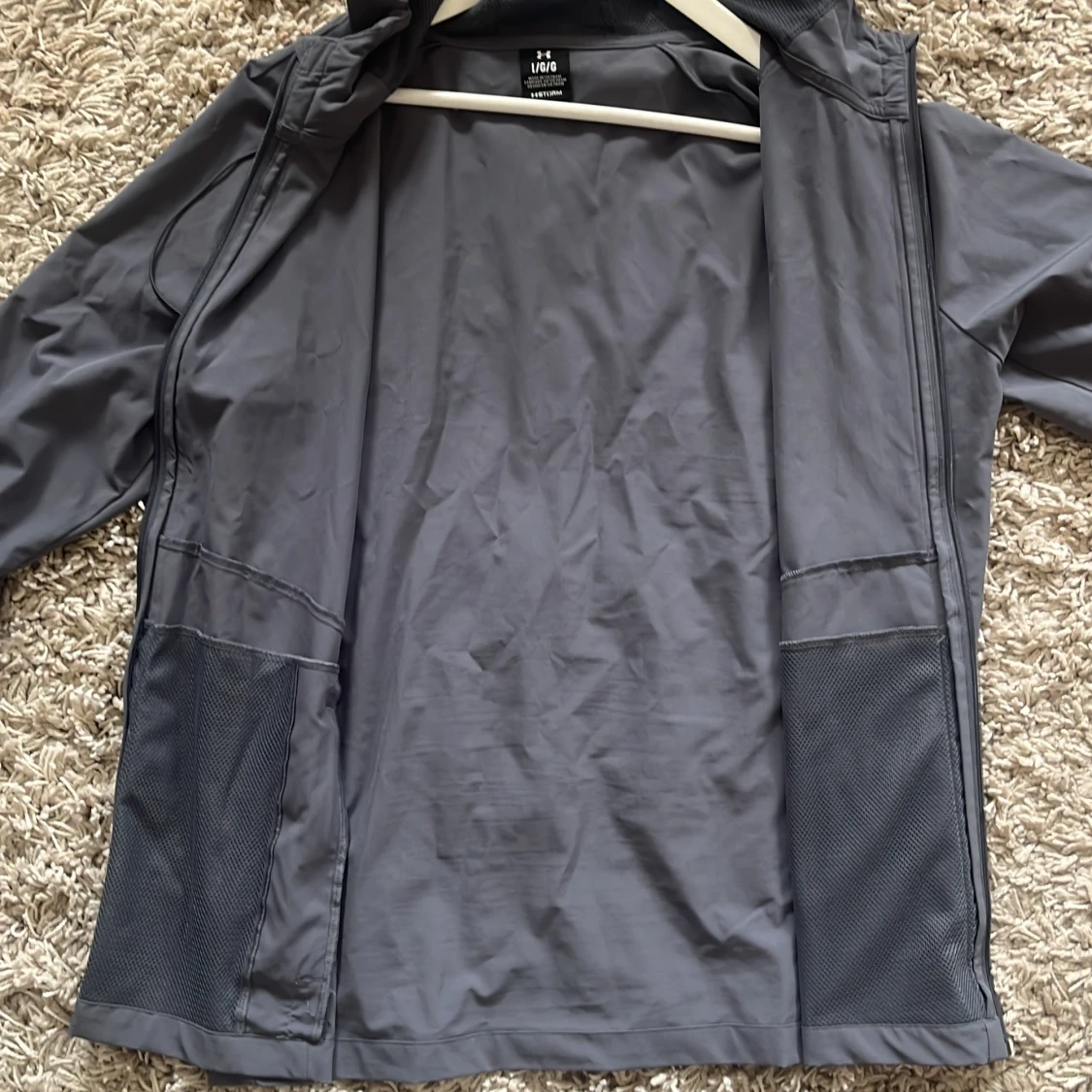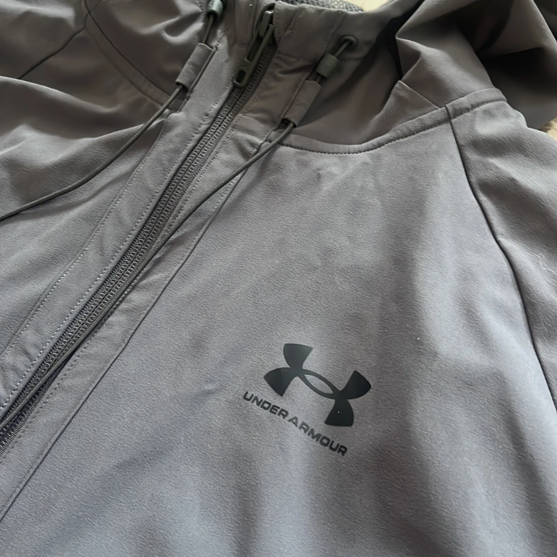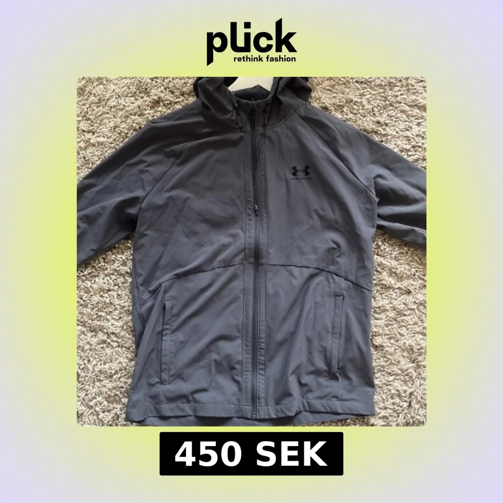 Säljer en grå vindjacka från Under Armour med huva och dragkedja hela vägen. Jackan har meshfoder, två sidofickor och en stilren look. Perfekt för blåsiga dagar och enkel att slänga på sig när du är på språng.